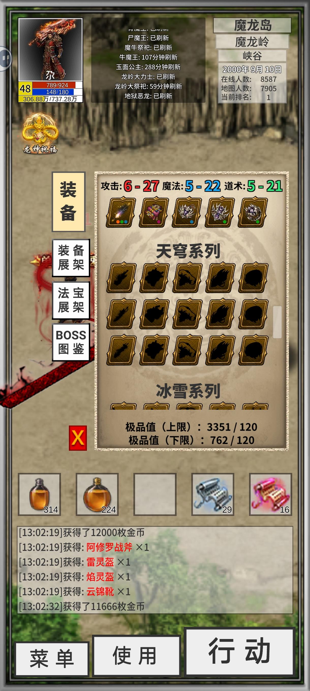 基础篇:1、开局刷九鼎戒指,骷髅大领主掉落,别问为什么刷九鼎,没九鼎玩这游戏就是坐牢,药水带不了几个负重就没了,打怪刚打两分钟背包又没负重了,最关键的是没药水离线时间太短,这游戏红蓝药水就是离线挂机时间战士三四级学了两级基础剑法就能打,看广告,用广告点数直接打骷髅,十次一般都能出个九鼎,倒计时24小时结束前爆率极高,不出就删号重来道士同理,三四级学了精神力和回春术就能打过,不出删号重来法师