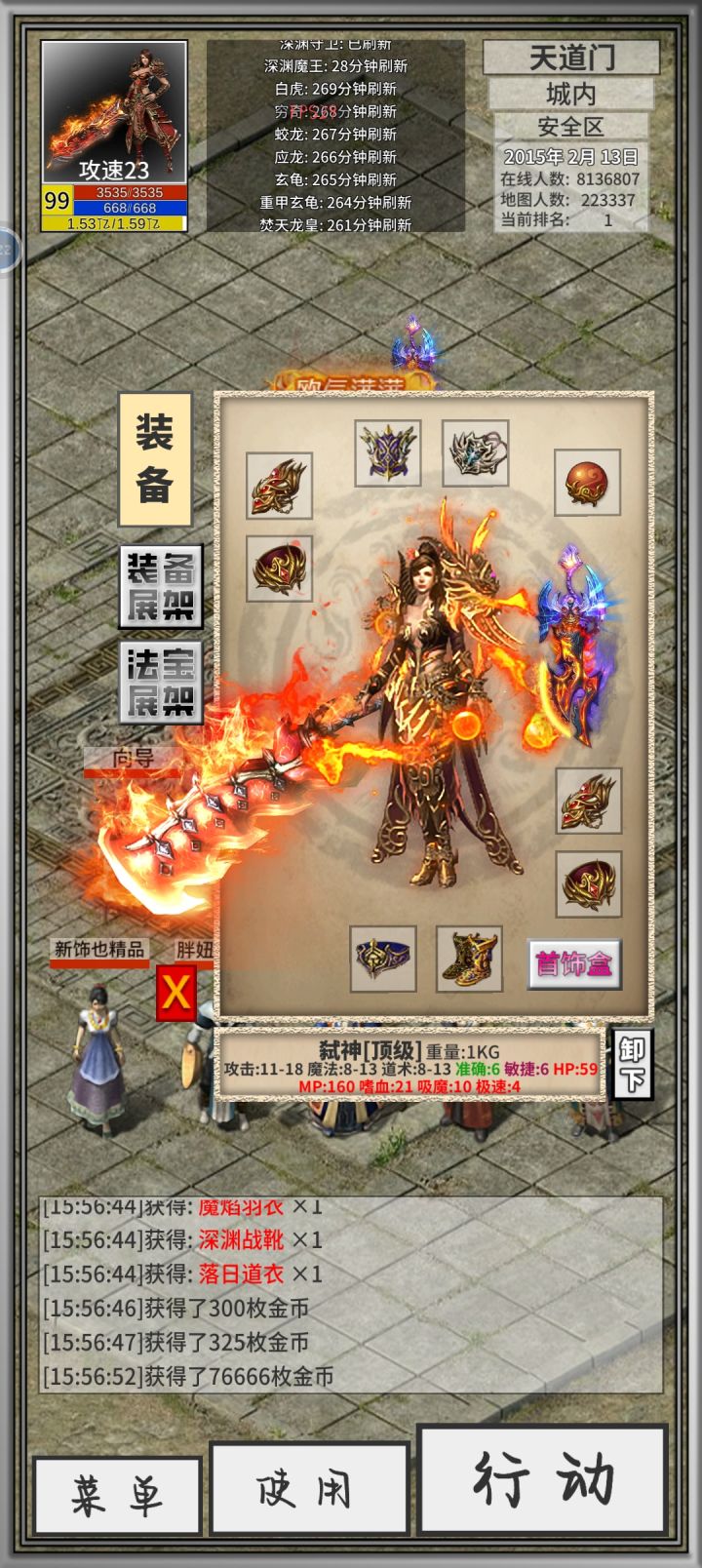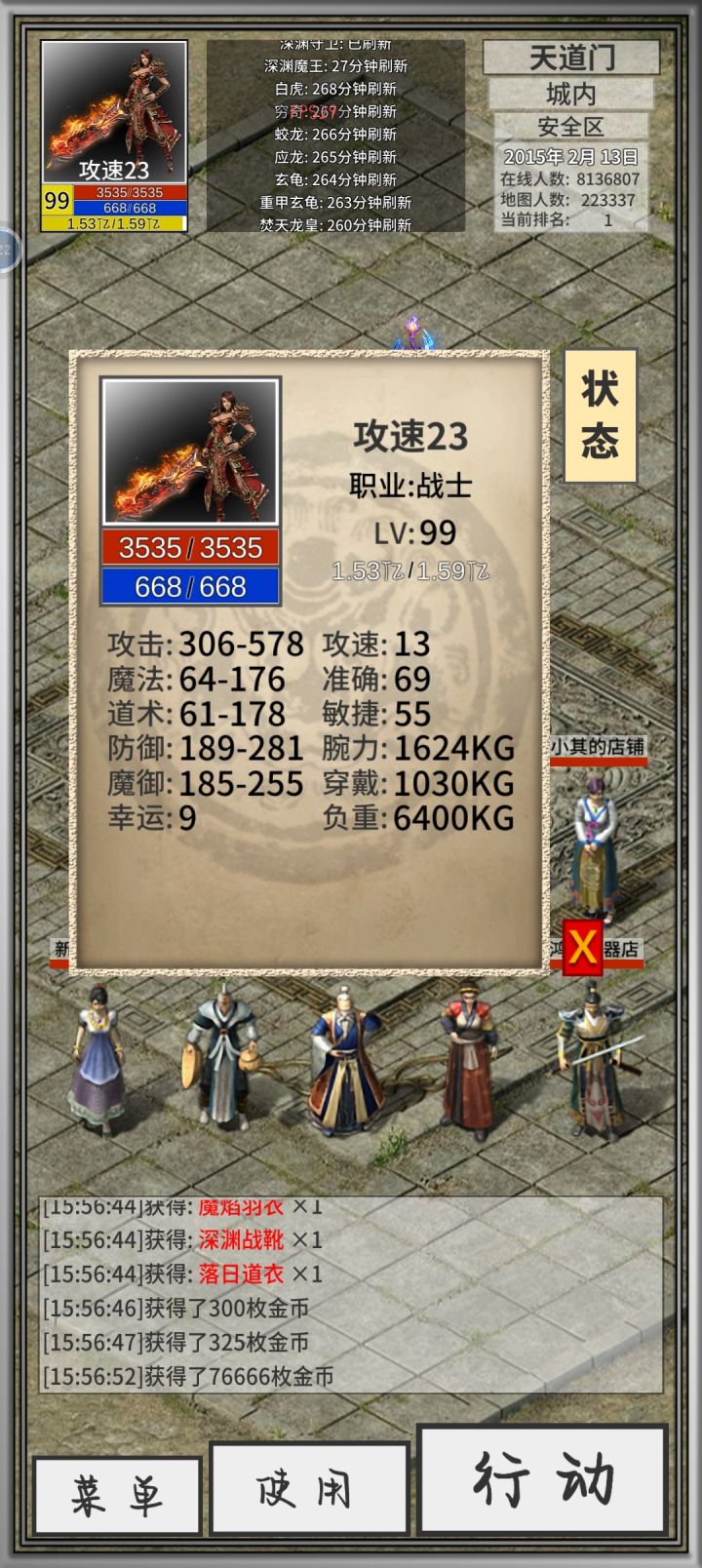 基础篇:1、开局刷九鼎戒指,骷髅大领主掉落,别问为什么刷九鼎,没九鼎玩这游戏就是坐牢,药水带不了几个负重就没了,打怪刚打两分钟背包又没负重了,最关键的是没药水离线时间太短,这游戏红蓝药水就是离线挂机时间战士三四级学了两级基础剑法就能打,看广告,用广告点数直接打骷髅,十次一般都能出个九鼎,倒计时24小时结束前爆率极高,不出就删号重来道士同理,三四级学了精神力和回春术就能打过,不出删号重来法师