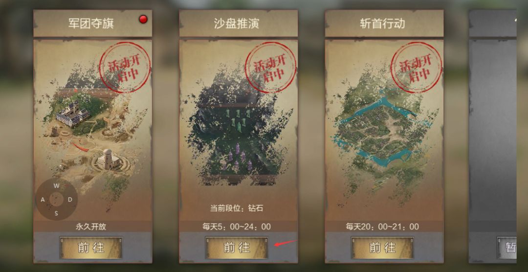 一、参赛入口 军团→军团活动→沙盘推演,如下图所示: 二、玩法规则 1、军团段位: 共分为5个段位:白银、黄金、钻石、王牌、传奇 2、分组积分赛制: 周一至周五每天5:00~18:00为报名时间;比赛时间为周一至周五18:10~18:30,一周打5天; 参赛选手需要报名后才能参加比赛。 每场比赛可设置6名参赛选手,由军团长和副军团长设置;6名参赛者以3种身份参赛:王牌、精英、主力,身份不同,胜利获