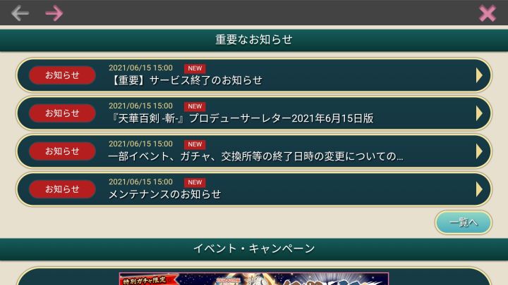 2021年6月15日下午15:00分,天华百剑-斩!终止运营通知。