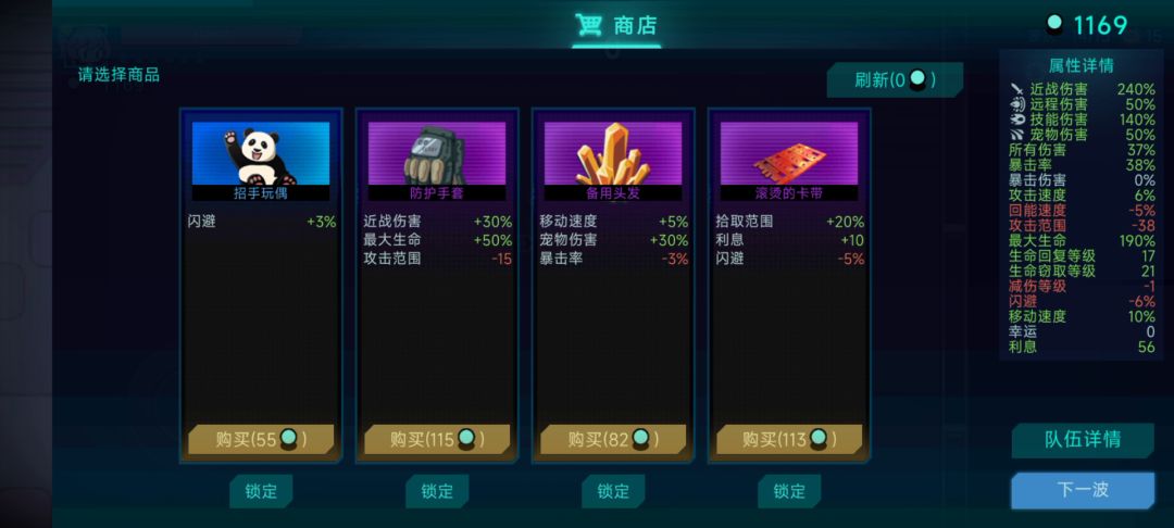 今晚挺欧的,后期随便刷新商店买技能,爽到了。 因为本想追求极致输出,所以对于减伤什么的根本没在意,最后差点翻车。 攻击类的数值堆的都挺高的,唯一遗憾的就是攻速一直都没有堆上去。