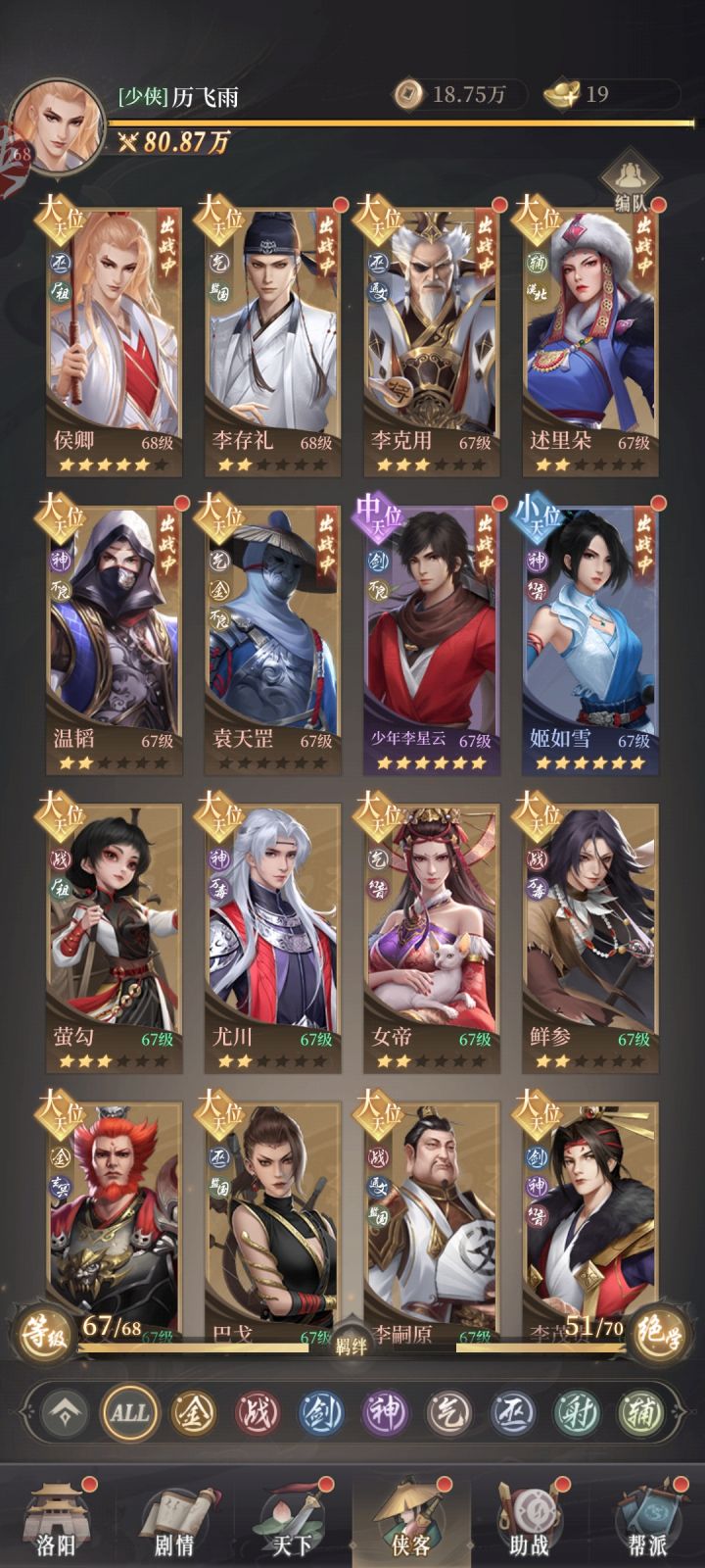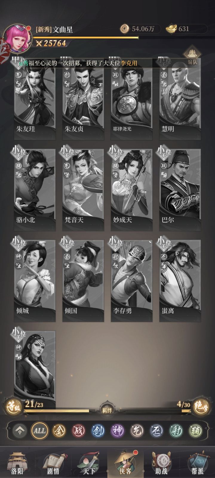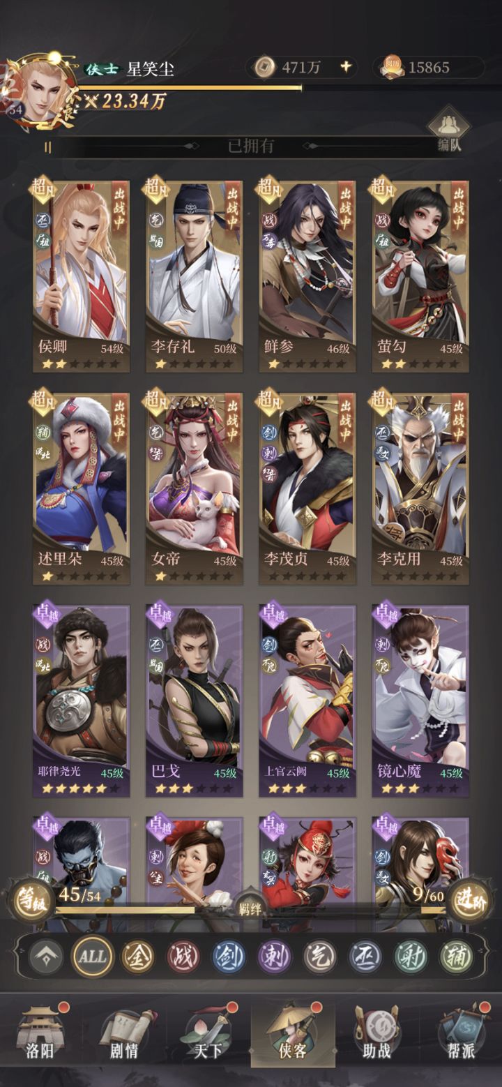 所有的角色基本都有了,但是我的李星云才升到中天位。说一下个人看法:1 首先很多玩法都内置一套氪金系统,每次上线都有一个红点(氪金提示用的)强迫症表示很难受。2 羁绊有很多,但并不平衡 每次我副本遇到幻音坊或者蚩梦过多很大几率会因为时间不够判输。3 部分人物实力和势力有误(石瑶,三千院等等) 4 人物并不完整(比如,阳叔子,本人,李存惠,俩判官,九天圣姬,十二峒等等)。