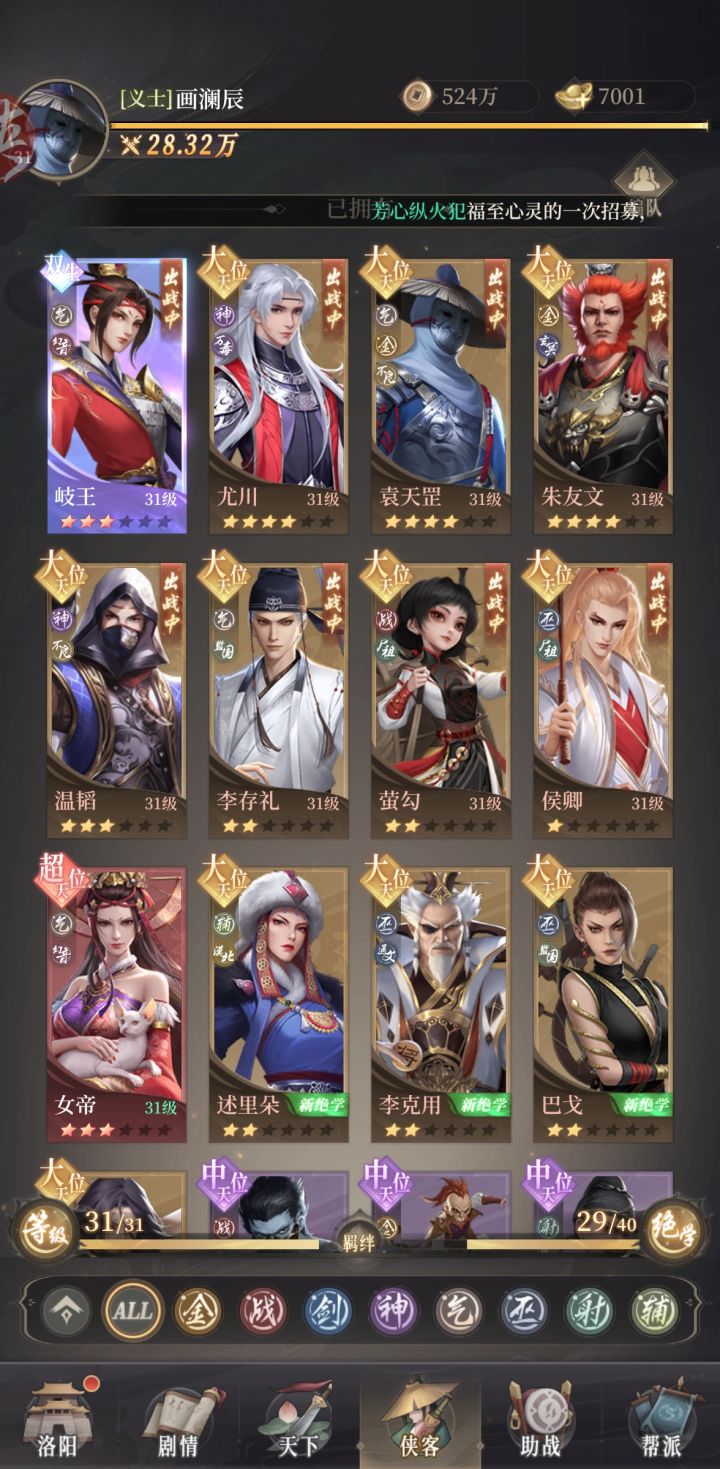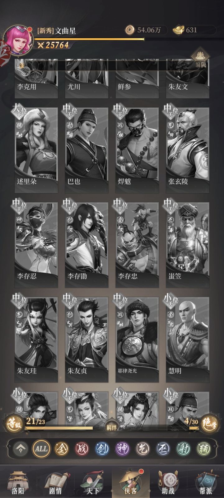 所有的角色基本都有了,但是我的李星云才升到中天位。说一下个人看法:1 首先很多玩法都内置一套氪金系统,每次上线都有一个红点(氪金提示用的)强迫症表示很难受。2 羁绊有很多,但并不平衡 每次我副本遇到幻音坊或者蚩梦过多很大几率会因为时间不够判输。3 部分人物实力和势力有误(石瑶,三千院等等) 4 人物并不完整(比如,阳叔子,本人,李存惠,俩判官,九天圣姬,十二峒等等)。