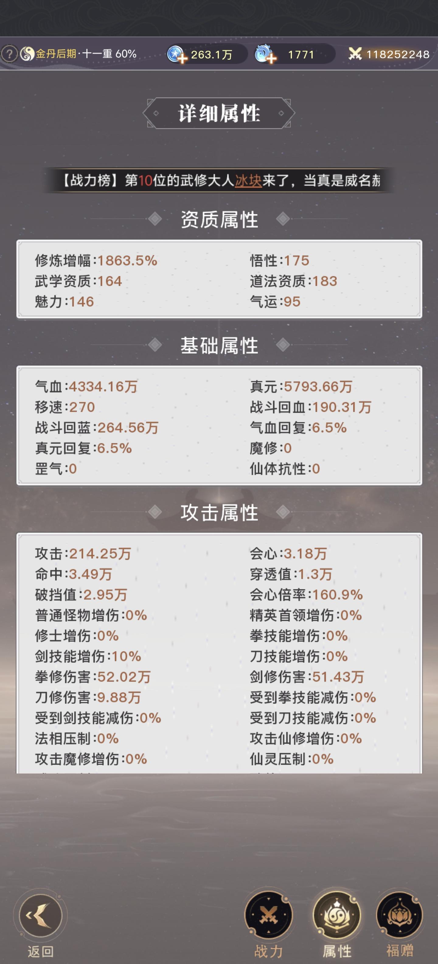 用手搓关的兄弟应该都被339的boss恶心过,强中的控加上明明躲过去但还是打出伤害的技能,但我发现我们区有个人8000万出头的时候就过了,上面低的是他现在的数据,他过的时候还没这么高,高的是我的,要是没那强中的控,你说我技不如人我认(我还配了跟他一样的技能打了几十次),但有那强中的控他这个面板都扛不住一套,所以这个号要么是内部号要么利用了bug#大武道攻略