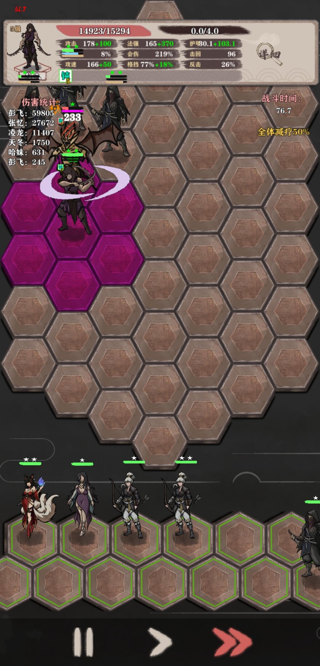 彭飞还是比较稳定。出肉能抗,被动叠法强能打。凌龙穿两个鼓🥁叠甲叠攻击力。锦囊带团结护甲高,带装备强化+1省钱。