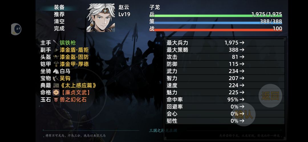 涿郡内往左上走见桃树见证三结义张飞送你肉 张飞院子紫树有灵石。 武器店内宝箱鱼鳞盾 对话光头佬获得镔铁枪 获得见闻 武器店右边无头房左下三千金 走的时候路过桃树摘了一片桃花给飞燕别在发间,飞燕小脸似醉酡红⁄(⁄⁄•⁄ω⁄•⁄⁄)⁄,魅力加一。 出涿郡往右入山洞。 山洞干掉所有喽啰,开所有箱子然后往上走见门遇头目,杀之开门扫荡宝箱还有个米酒。 回涿郡见光头完成见闻。 子龙身骑白马入邯郸,赵云乡间陌上