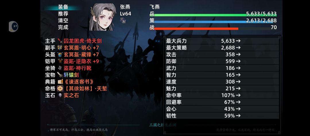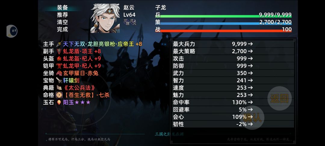 现在随着作者更新,第二周目也是终于出来了,我给大家讲讲张宁的玩法,阿宁是第二周目的角色,第一周目是获得不了的。第二周目阿宁进队的时间很早,是最适合前期的角色。阿宁有两种通俗玩法:一种为纯辅助,第二种是以张宁为副C的玩法(张宁是当不了主C的,这点要记住,就算拿张宁当输出,也只能是副C)。辅助张宁:因为有黄天延命咒(推迟死亡持续三回合)和奇正相生(武:武力提高50%智力,降低50%,智力提升50%,武
