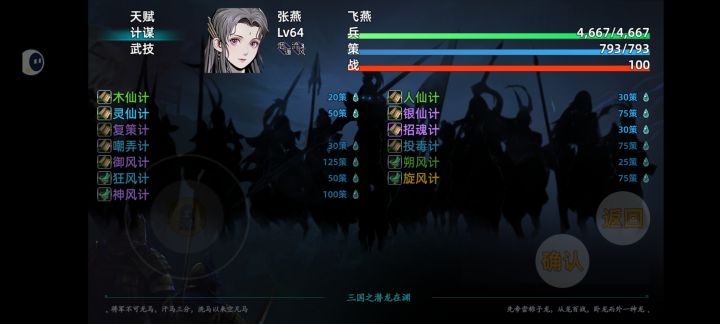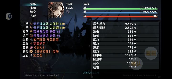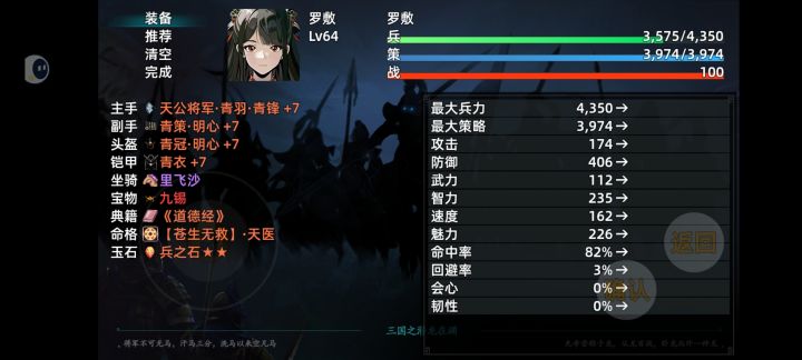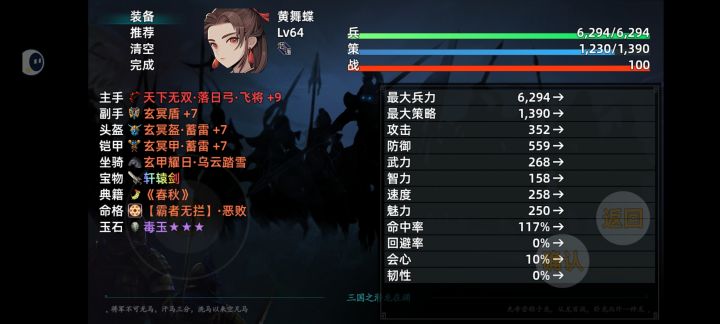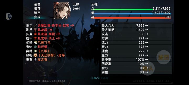 通关了,没怎么去弄装备,后期就基本跟着主线走,神器什么的都没做,后期赵云(基本只能用来压血线和斩杀了)是真的乏力啊,估计是无双开多了,虚了;还有闪避大王飞燕(属性太低了,计谋也学不了几个,肯定是有意为之,不然非常强,也许能用黄舞蝶的思路来打)。队伍主C,黄舞蝶,全体dot和暴击混伤,在装备垃圾的情况下简直是神;队伍奶妈,秦罗敷,奶量杠杠的,就是速度太慢了,不过尾速也有好处就是了(苍生无救神级命