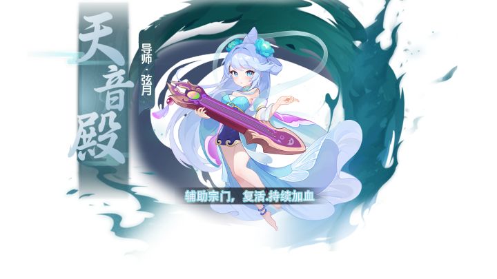 天音宫导师:弦月门派天音宫是一个主为辅助的门派,是复活,持续加血的重要角色技能介绍:【余音绕梁】:单人治疗初始技能消耗:100灵气初始技能效果:使多个目标获得【余音】状态,持续5回合(技能等级越高,恢复生命越多)余音:每回合恢复一定生命【琴韵调和】:群体治疗初始技能消耗:200灵气初始技能效果:结算全体友方的【余音】状态,根据状态剩余回合恢复生命(技能等级越高,恢复生命越多)【