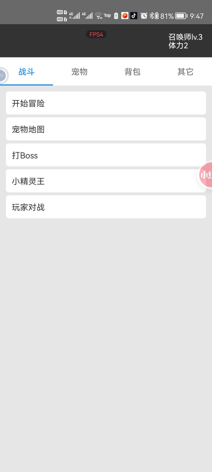 1.进入游戏首先是会看到这个页面。2.当你点击开始冒险的时候会发现,自己一个宠物都没有!!!!!那宠物怎么来呢?点击【宠物地图】再点击刷新,每次刷新都需要10点体力。会看到几个宠物,全部都抓(为什么都要抓,不一直刷好宠物,因为宠物可以卖钱,金币非常重要,大部分玩法都要用到金币)建议是先在【其他】的位置输入兑换码【精灵666】后全部体力用来刷宠物,抓宠物。3.当所有体力用完就在【宠物】一栏看宠物