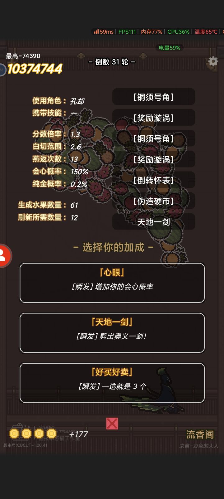 把一局正常会刷新的五种水果全用天赋去掉就能刷出来啦,主要是真的很好看诶。而且和点金仪式搭配起来可以稳定做到遍地黄金,一样可以无限回合。(建议用天地一剑清屏,不易卡顿)