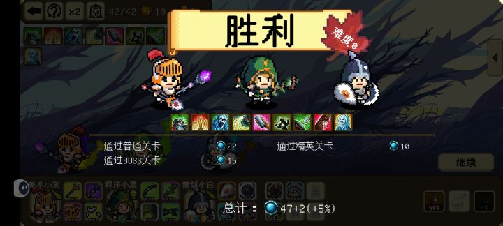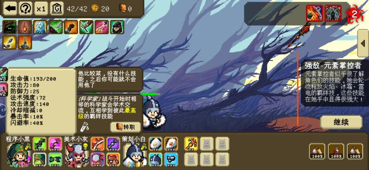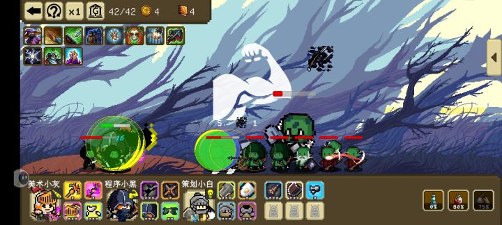 开局没多久就出来一个零元购和一个天才,因为开局轮盘给了个冰剑,前排就用冰了,前期算比较难打,但冰系濒死的时候还能回血,勉强能抗,又拿了个血瓶(恢复每个人50%血)保命,后面又随机出来两个科学家,两个冰系大招轮流控(一个有减冷却的,两个冷却不同)复制药剂又复制了个零元购,然后金币就可以全部用来升级了。到第三轮把几乎所有装备升满了,多出来的位置还能再拿三个橙色装备,可惜刷出的装备基本都是法伤的,两个人物没什么伤害。