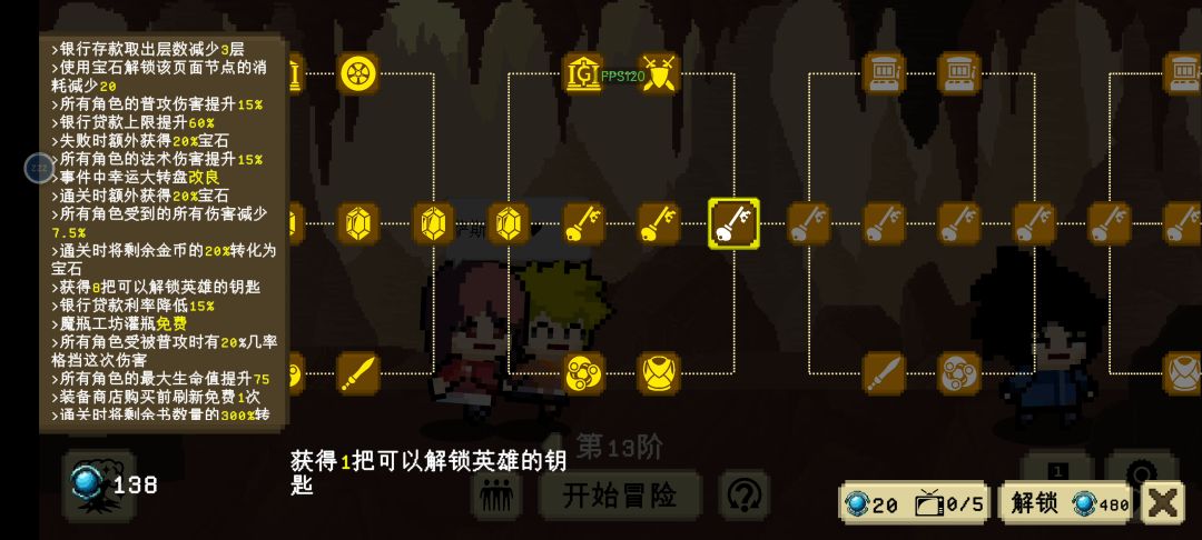 新手钥匙建议解锁宙斯,波塞冬,哈迪斯通关三次解锁隐藏角色,解锁的特殊隐藏角色额外加宝石。天赋的话优选中间那行,上方的也可以点,可以让游戏内经济更高更容易通关(如果遇见无法解锁的天赋,退出游戏重新登陆)如果要解锁上方的经济天赋,需要下方一起解锁才会解锁下一页的经济天赋关于关卡,🗡️图标的是普通怪(打完掉落少量金币跟转职书)🎲图标是随机事件(例如金币,生命,转职书转盘还有各种诅咒负面事件也有无负面