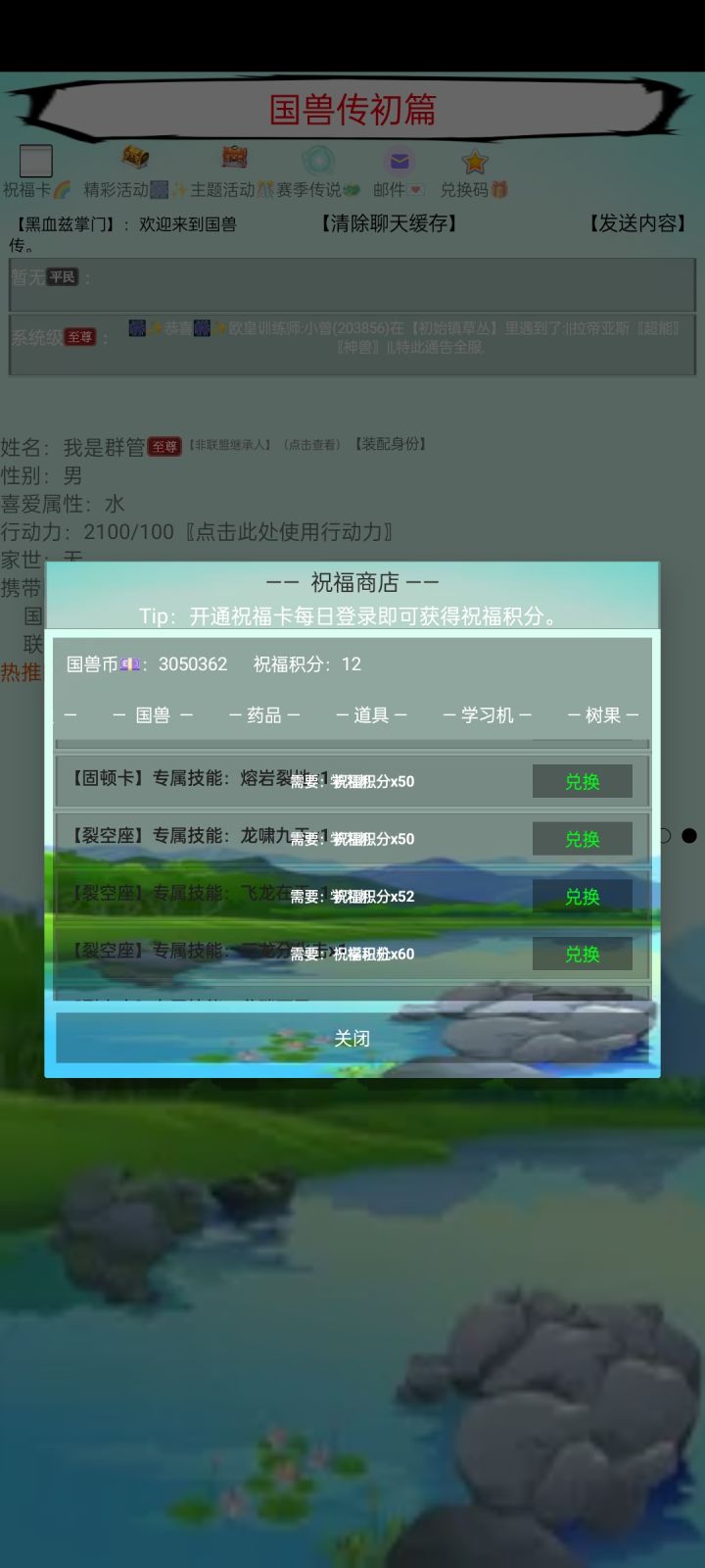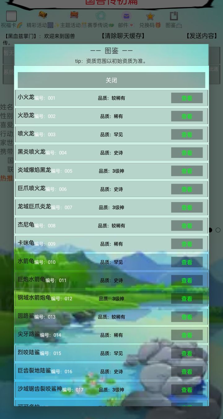 我们的原则就是白嫖,白嫖,白嫖……把白嫖贯彻到底。一、初始刚开始很迷茫,迷茫就对了,这是文字游戏,首先就是了解游戏刚开始必做的事情:1,邮件所有奖励领取,白嫖2,背包的初始国兽蛋开启,选择对应属性的国兽,三只相差不大。白嫖3,给初始国兽吃超级糖果,吃一百个够用了。二,起点做完这些上面这些事情后,我们的核心就要调整了,冲级,对冲级!所有功能都建立在等级上面。没有等级一切免谈。冲级我