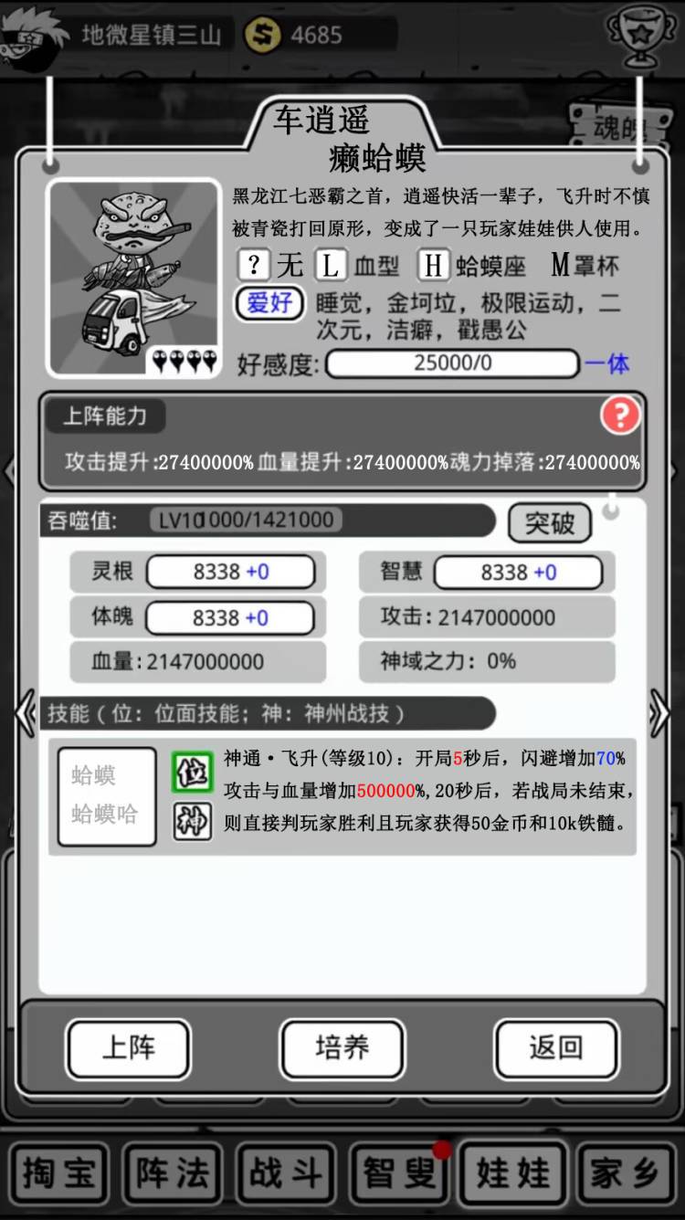 娃娃界面有四个功能 合体,吞噬,进化,调教 合体,可以将两个娃娃合体,如果这两个娃娃有合成序列,则会合成出一只全新的娃娃 在炼气期时,可以研究合体操控大法,自由选择两只娃娃是换头还是换身体(解锁前完全随机) 下一个功能,吞噬 一只娃娃初始拥有500点攻击和500点防御,可以通过吞噬狗粮进行增加,也可以通过吞噬转换粮进行攻转血,血转攻的操作 娃娃我不建议喂平衡,可以纯攻击或者纯血(方便后期换头),除