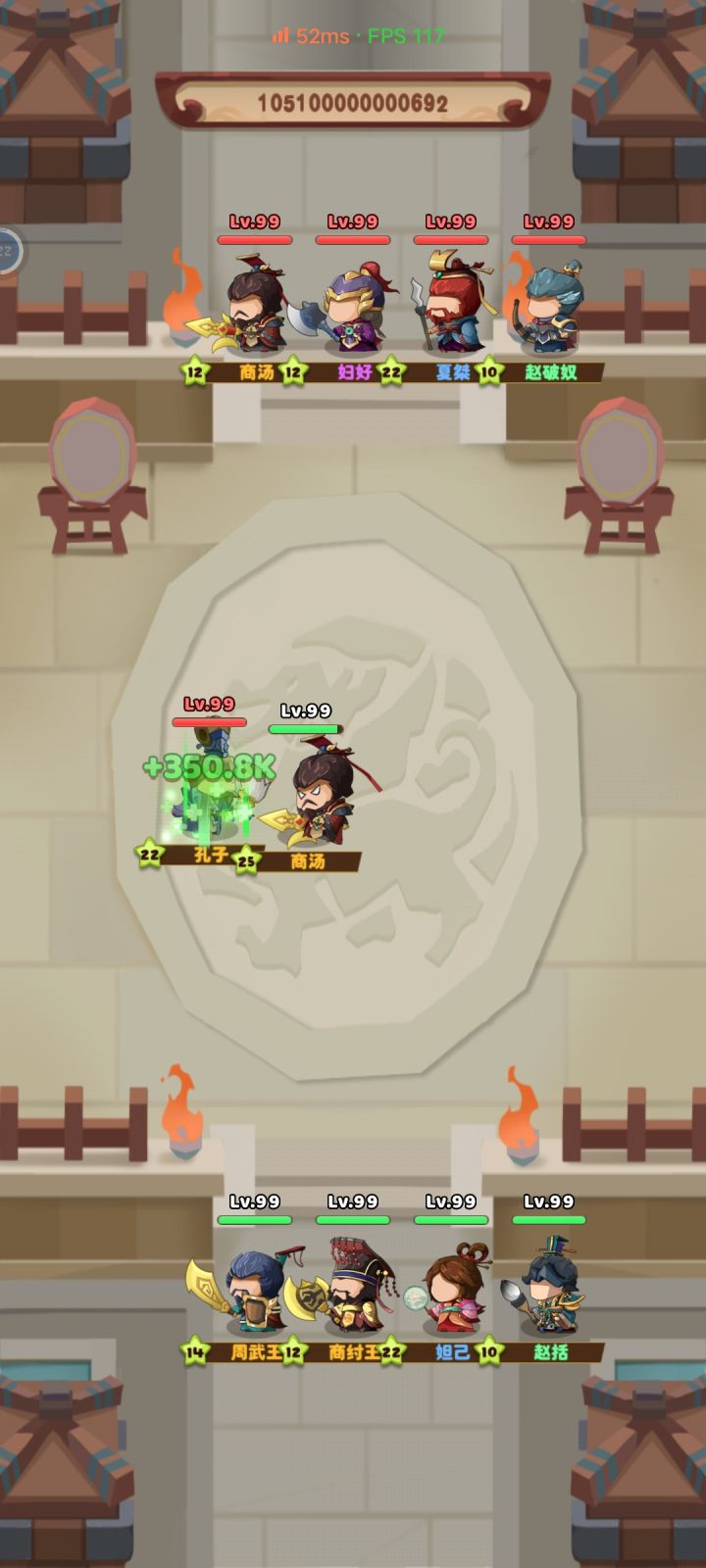 目前470关,阵容商汤 老子 孔子 孙武 齐桓公 ,墨子已经解锁了,明天看广告抽了,换掉齐桓公(其实齐桓公伤害可以的,奈何商汤等级太高了),接下来就是攒3倍经验升墨子,冲击280出韩非子凑个开宗立派(20%攻击)