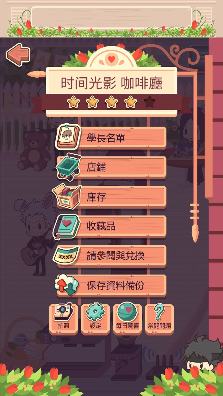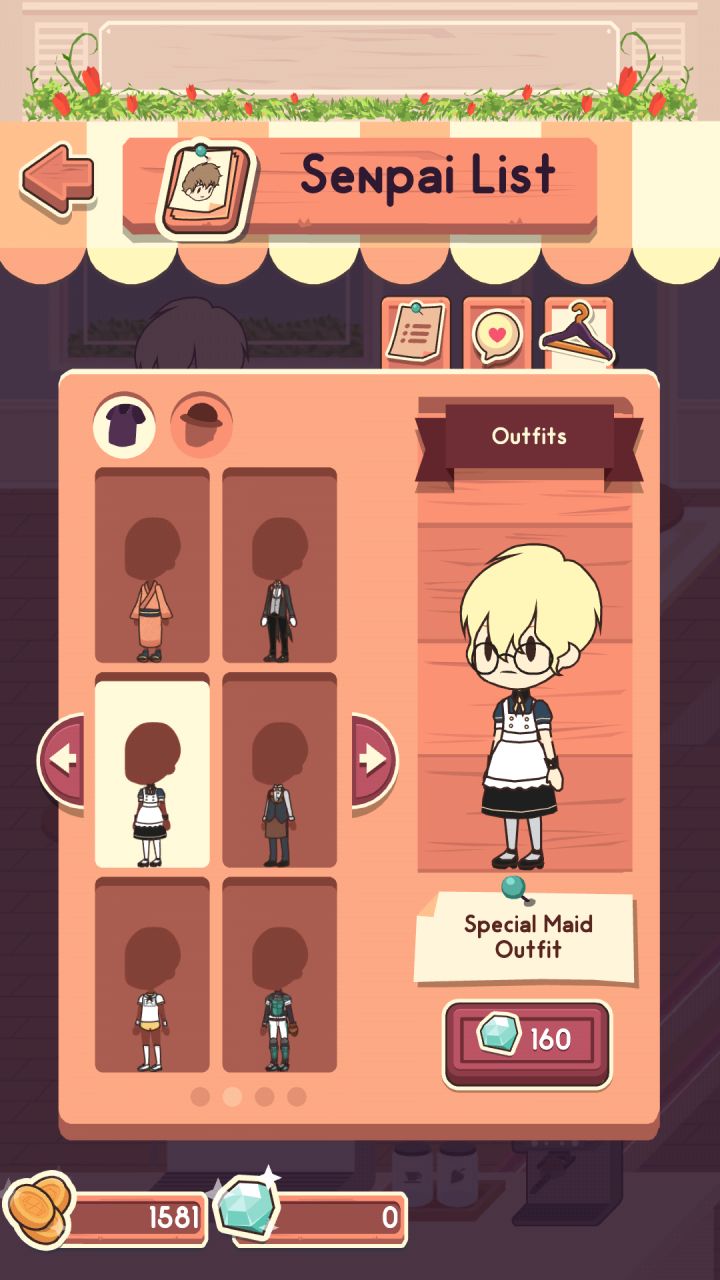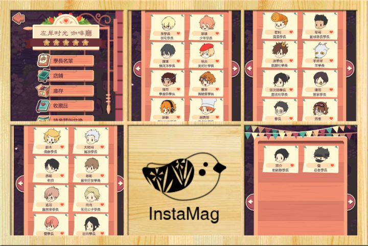 结果是不要通过时间刷档!看我发帖日期!说一下这几天玩耍出的经验。除了一开始就来的学长,其他学长是需要商店的特定物品吸引的。新学长除了需要喜欢的物品来吸引,还需要更昂贵的咖啡来喂。学长喜欢的东西有三个,第一个是固定不变的,后两个会因为他们来店吃的东西的次数变化。场景买之前我以为贵的空间会大一些(根据预览图的比例),结果还是十张桌子。桌布和桌子上的东西不能同时摆放´_>`,前期可以不用买了