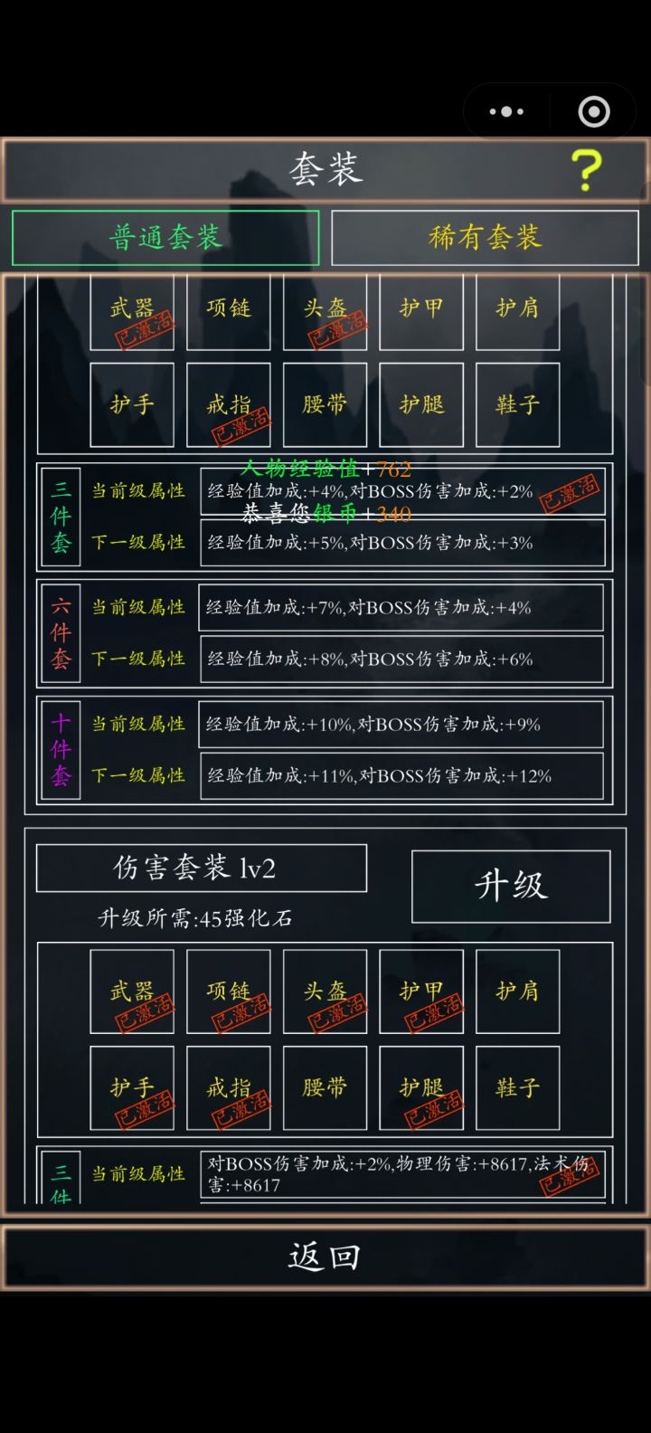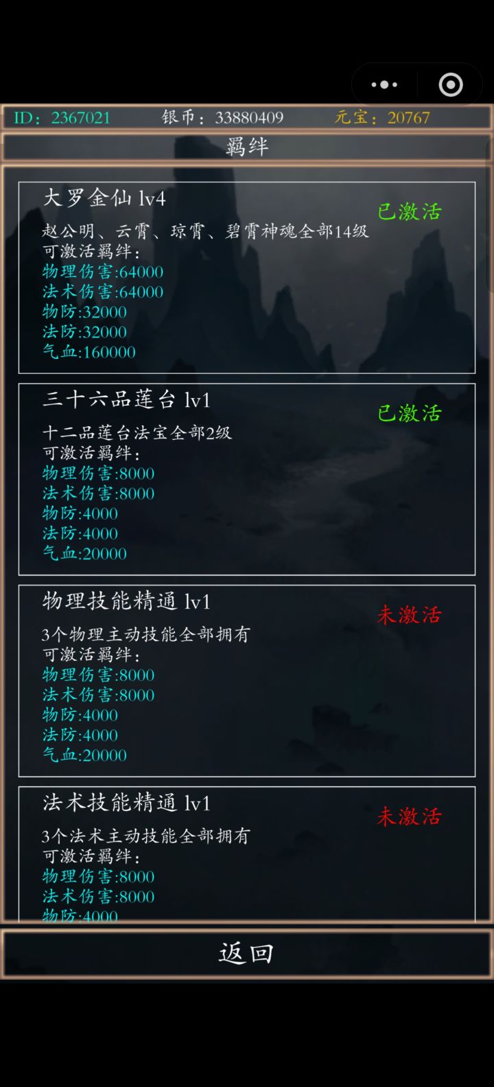1、套装全收集普通套装:经验3级,伤害4级;稀有套装:鸿钧5级,盘古5级,扬眉4级,时辰3级;2、装备:武器护腿化神7阶,其他化神8阶;3、境界:大乘2阶;4、法宝:黑莲6级,红莲、金莲5级;5、神魂:盘古5级,三霄都27级,赵公明28级,阵法7级;6、翅膀:彩翼3阶9星;目前boss输出123994万,六技能都8级。