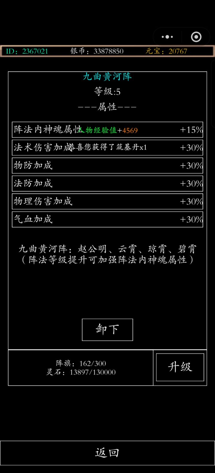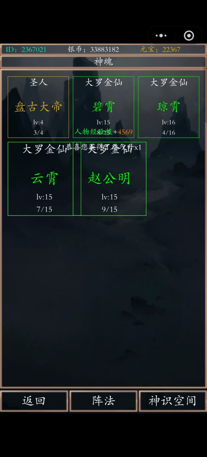 注:此游戏为佛系游戏,不喜欢的玩家可以先行离开,下面进入正题😊游戏基本玩法:偷装备,挂妖王,买套装,偷装备,挂妖王,买套装....1.兑换码VIP888,另外几个游戏公告里面就有2.元宝:主要通行货币,绝对不可以胡乱使用,前期可以用来买套装(主要),阵法,羽毛。挂妖王会给一元,五元(200级妖王以后)红包,3.法宝:没啥卵用,前期不用买,送的一个阵法就可以,升级靠白嫖4.技能:没有额外