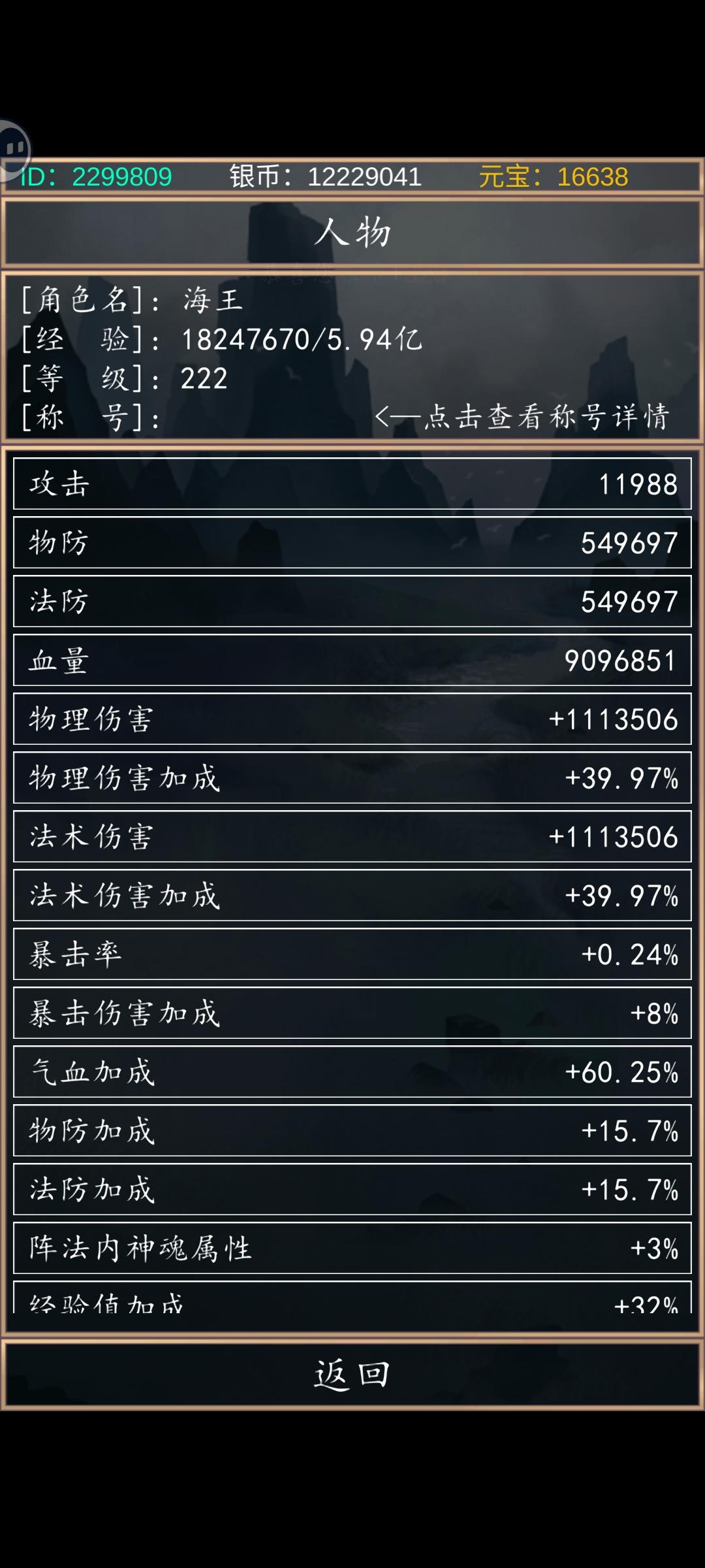 1、套装全收集普通套装:经验3级,伤害4级;稀有套装:鸿钧5级,盘古5级,扬眉4级,时辰3级;2、装备:武器护腿化神7阶,其他化神8阶;3、境界:大乘2阶;4、法宝:黑莲6级,红莲、金莲5级;5、神魂:盘古5级,三霄都27级,赵公明28级,阵法7级;6、翅膀:彩翼3阶9星;目前boss输出123994万,六技能都8级。