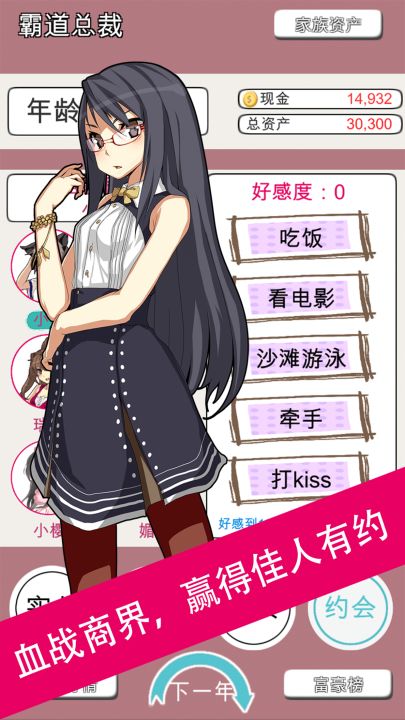 在商海沉浮中感受游戏与交友的乐趣!偶尔还能外出约会或者旅游,去邂逅美女帅哥,解锁意想不到的剧情!在游戏中你不仅能体验到建厂经营、培养人才的创业演练,以及投资合作、谈判收购的商战比拼;更有各色都市丽人为你打工,俏秘书助力你的总裁人生。快来实现你的总裁梦,指尖纵横肆意人生!