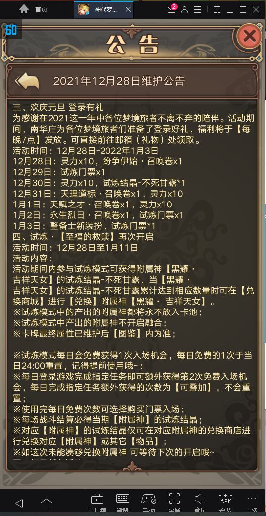 神代梦华谭1月26日更新了春节活动,我这里就挑重点给大家说吧_(:з」∠)_ 1月26日-3月1日维护前,附属神【月读十六夜】限时返场、饰品卡池开放抽取附属神【鲲】的装扮【深海之民】,感兴趣的朋友不要错过哦!~( ̄▽ ̄~) 然后就是天梯M24正赛开始了,只需打到传说就能拿保底(附属神皮肤),快来和群友们互投吧(笑) 最后还有件事和大家说一下,群友们准备以神代梦华谭这个游戏进行二创,并且策划了新春拜