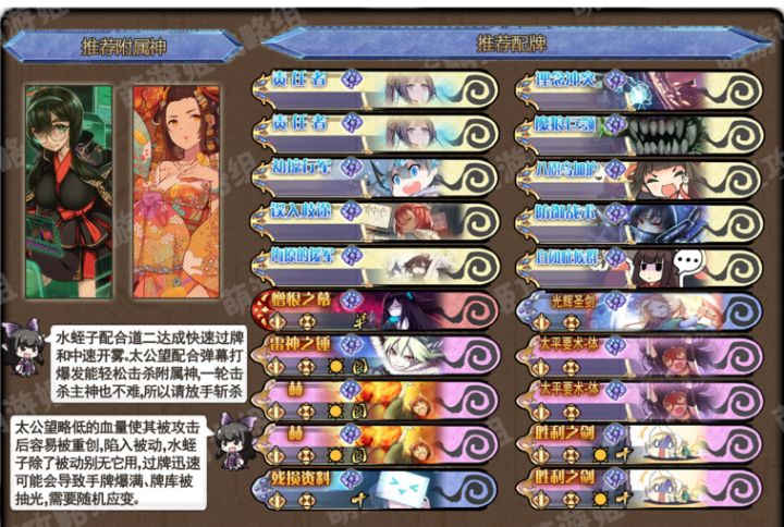 主神选择道德天尊(第2神威)附属神选择太公望(6/28)攻击时,手牌中所有弹幕卡降低1点行动点消耗(每回合至多发动三次) 角色优势:攻击能使弹幕卡消耗降低,有弹幕卡配合攻击轻松达成高爆发 角色劣势:略低的血量使其被攻击后容易被重创,陷入被动水蛭子(4/30)己方回合开始时,获得一张神迹卡[财富] 财富(0费,使用后抽两张卡) 角色优势:每回合额外抽卡配合道二被动时还有额外开雾,有了水蛭子就可