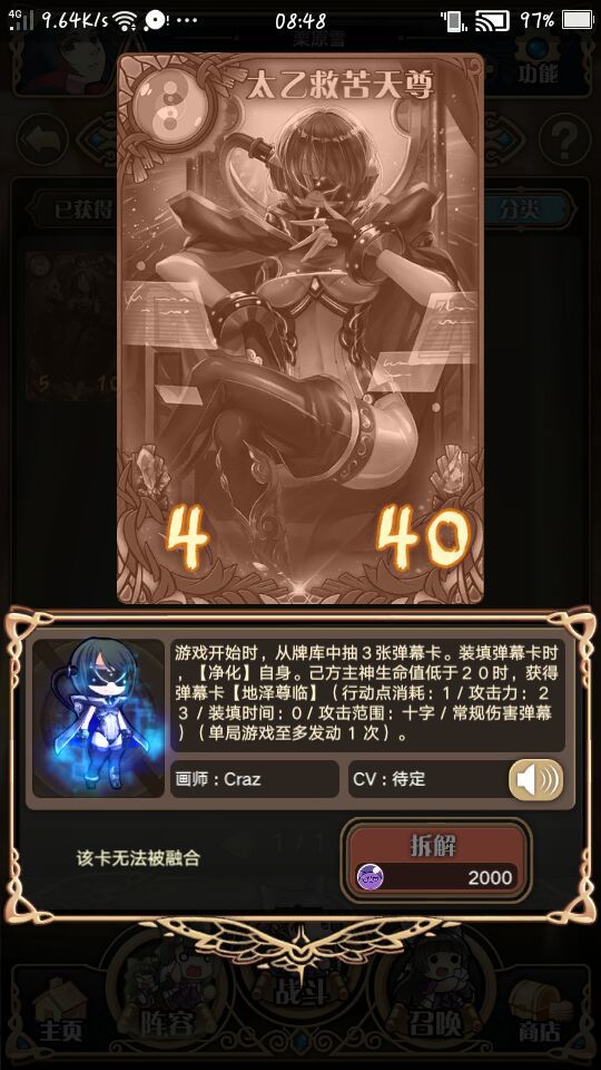 中秋节了,我们咕咕谭又出了一个新红神(倾家荡产抽出4个列御寇都没出货的我不争气的落下了眼泪)新神苦命我给出的评价:4星半(能在我这里拿到5星的m5~m6的新神只有冰洛基emmmmmm)技能1:开局抽取3张弹幕卡。这个技能看似随便,但在无数实战中证明其实这是苦命的核心技能!当你只带3张弹幕卡的时候就是定向检索,可以作为一个快攻将一套弹幕打出以极限爆发,例如开局核弹,对面:mmp,所以如果往后削的