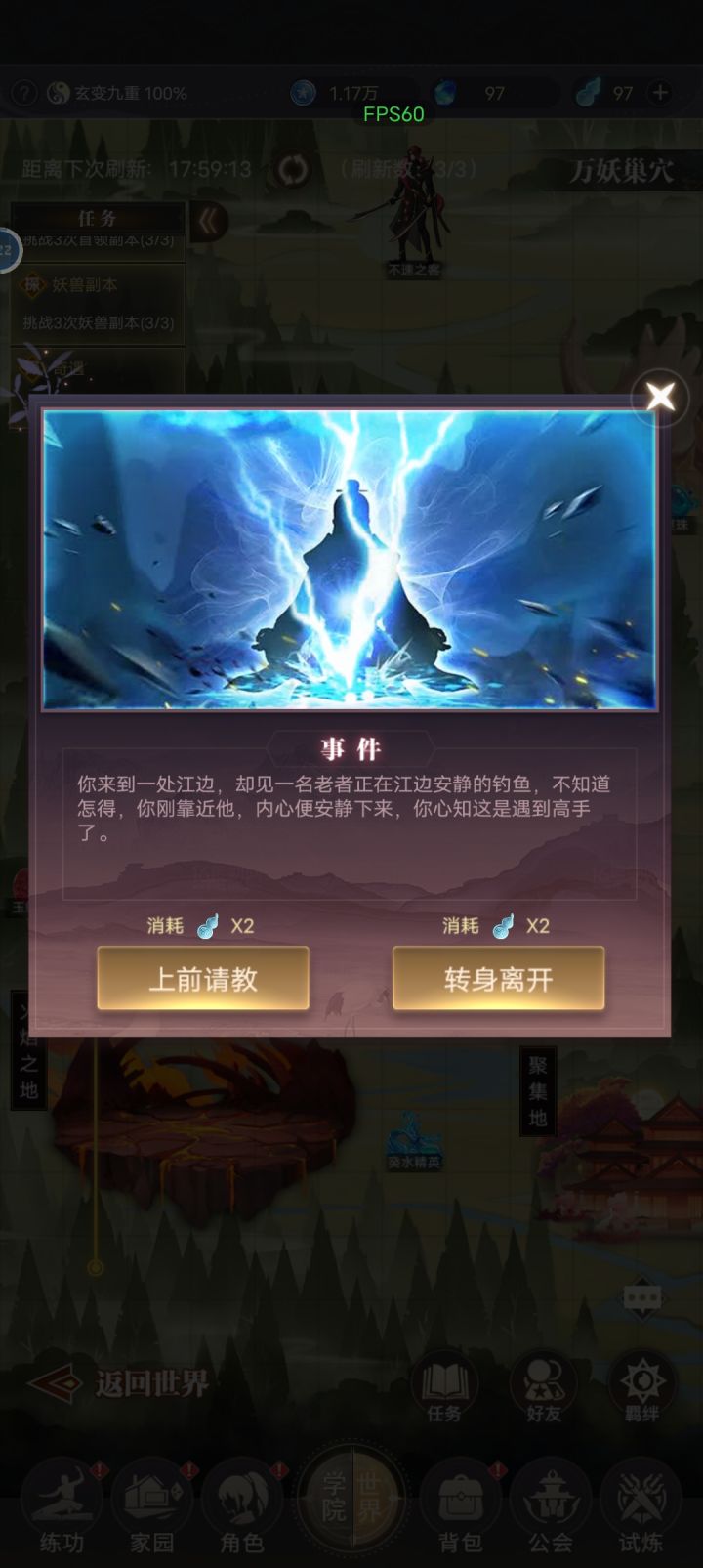 开局天赋:可看个人喜欢刷高品质3主流:拳 剑 刀拳:群体攻击/近战/爆发(比较适合新人)剑:单体攻击/远程/消耗(比较吃养成) 刀:范围攻击/远程/爆发(前中期比较强) 修为篇跟着推主线直到推不动,去世界模式的地窖刷修为,每天可以刷新三次探索,每次探索按照目前的数据是两个宝箱两个加修为的灵气点,一定不要忘了吃,另外在地图上随意来回走动会随机触发事件,目前我看来最有用的就是几个,(妖女,老者