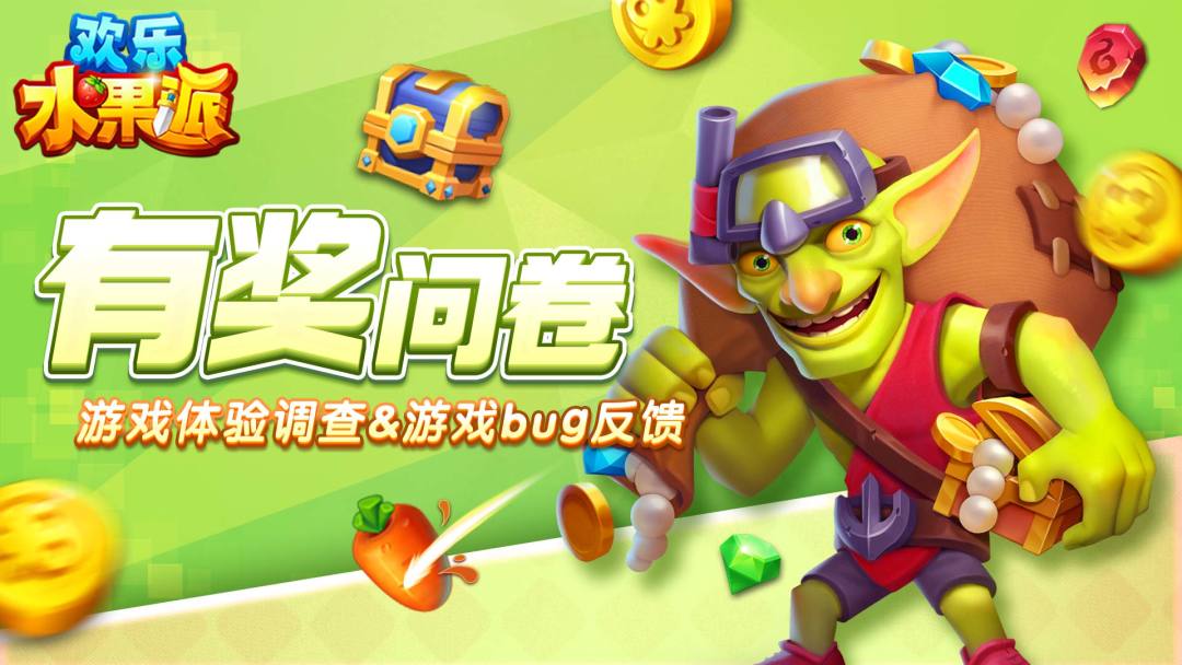 岛主们下午好~ 与大家正式见面有一段时间了~非常感谢各位岛主的支持~ 为了进一步提升游戏品质和游戏体验,我们正在进行一项针对《欢乐水果派》用户体验的调查问卷。 诚邀大家参与,借此帮助我们更好的对游戏进行优化和完善~ 【问卷链接】 【问卷奖励】 填写问卷成功提交后,即可获得礼包码,请在游戏中自行兑换哦~ 【问卷规则】 本卷采用匿名制,不涉及个人隐私,题目选项没有对错之分,请您根据实际情况填写,再次感