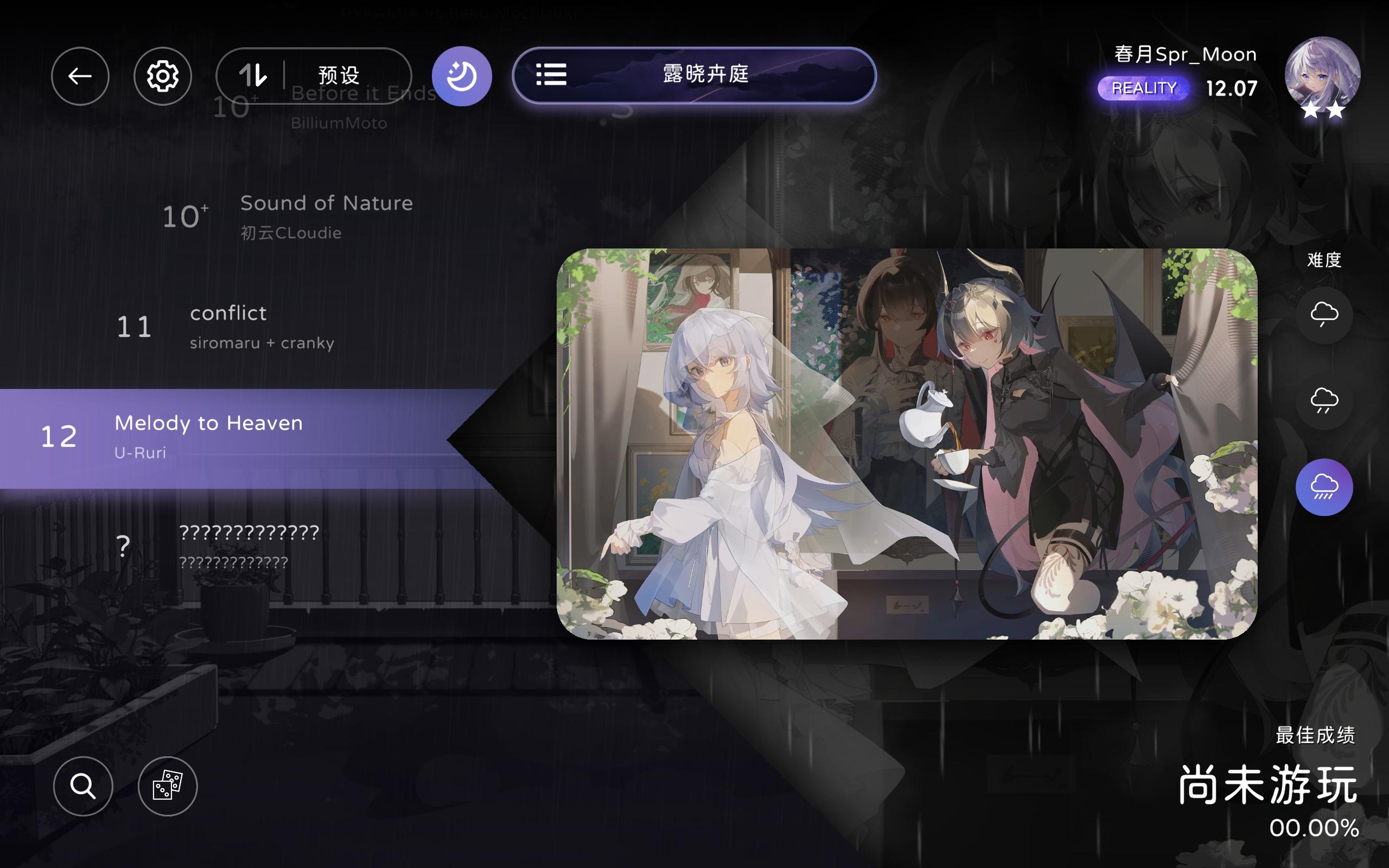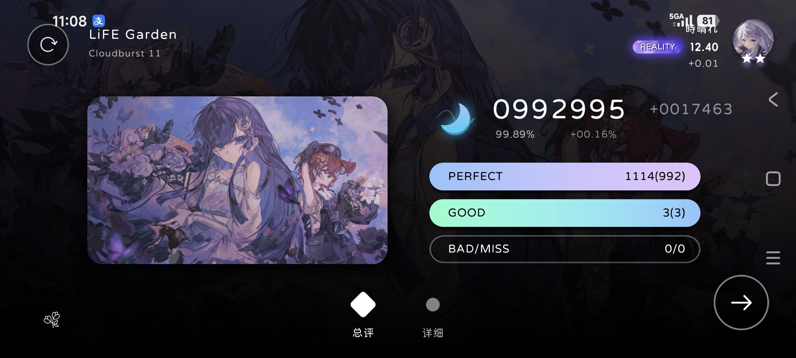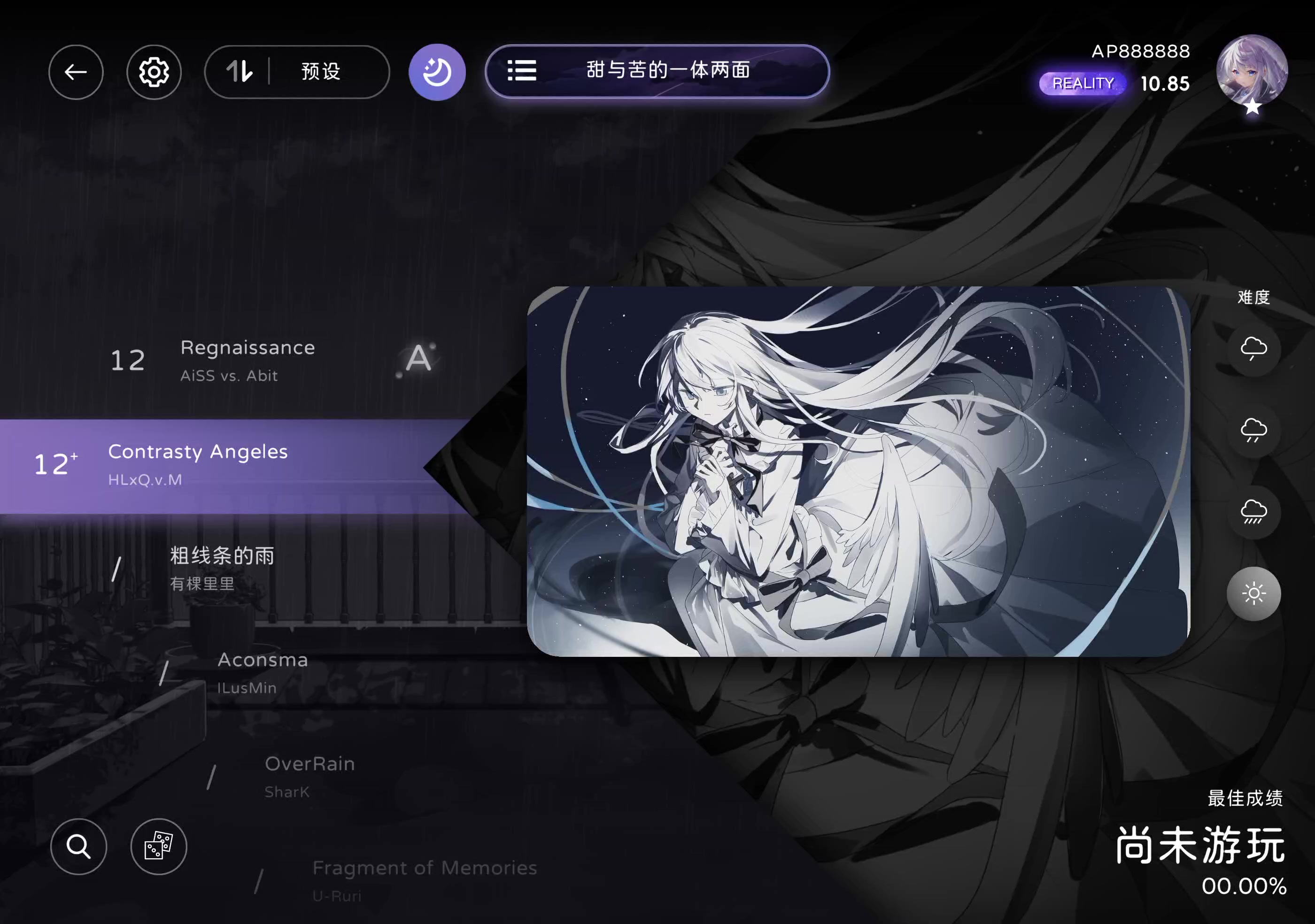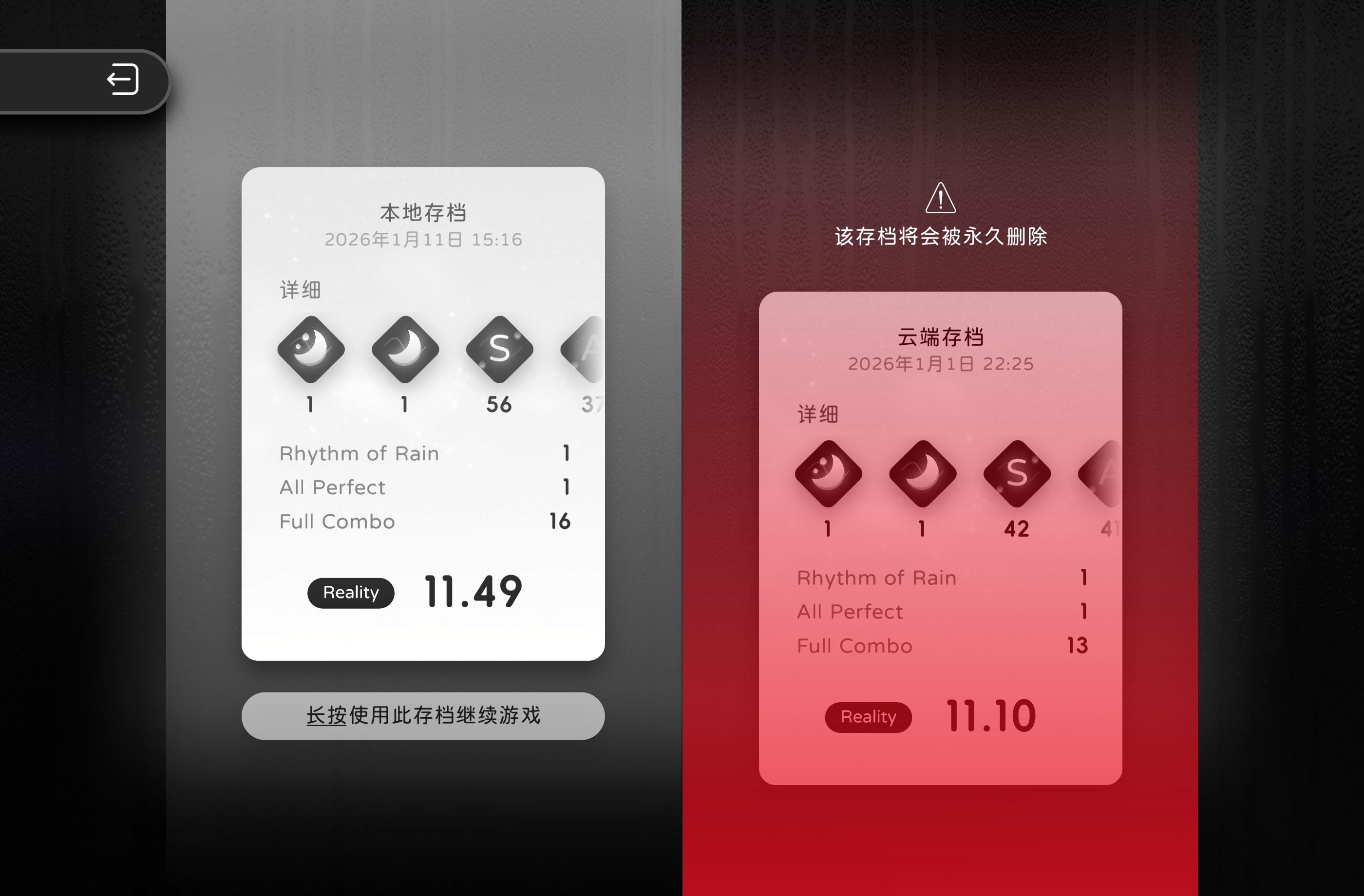 因为一直打不到紫reality,明明查分器上显示已经紫了,前20首也是新成绩,但还是白的,然后之前剩下的旧谱面也打不上去,所以决定从零开始,但还是留了个存档保底的,什么时候不想打了再下载存档回来,反正现在也到了瓶颈期。唯一恼火的是星要重打了,还要种不知道多久的地……唉,也许,只有当自己亲手毁灭自己所拥有的一切后,才能更放下自己骄傲的资本吧。希望早日重回11+