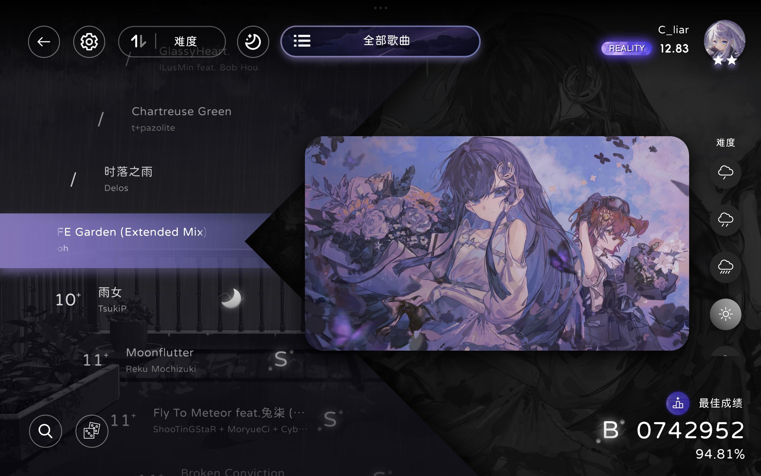 因为一直打不到紫reality,明明查分器上显示已经紫了,前20首也是新成绩,但还是白的,然后之前剩下的旧谱面也打不上去,所以决定从零开始,但还是留了个存档保底的,什么时候不想打了再下载存档回来,反正现在也到了瓶颈期。唯一恼火的是星要重打了,还要种不知道多久的地……唉,也许,只有当自己亲手毁灭自己所拥有的一切后,才能更放下自己骄傲的资本吧。希望早日重回11+