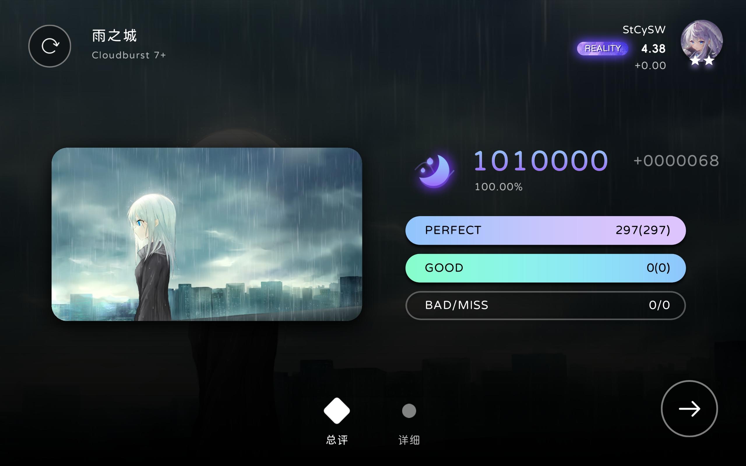 长条看了介绍也不是很懂()打了很久,就p了一首7+,准度也不是很看的懂判定,不知道是延迟没调好还是越级导致的,总之一把下来小p几乎全是late()顺便问问沉浸度是怎么加的,好像加到40%多后打歌不加了?(可能是错觉)还有就是有没有什么歌和谱子推荐()