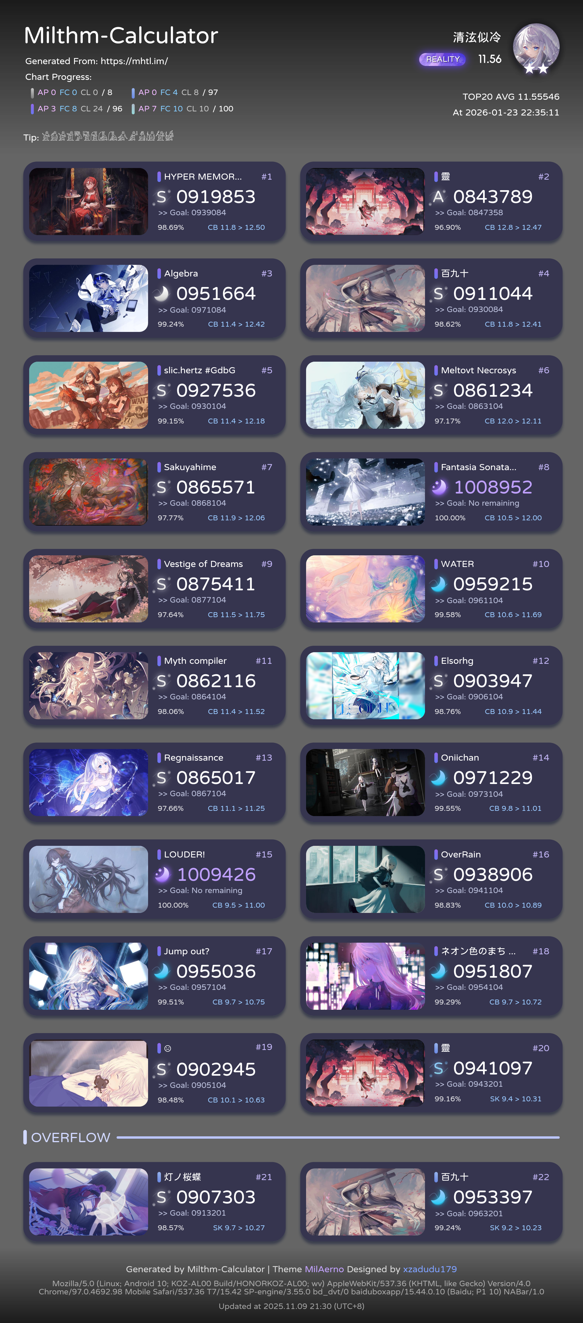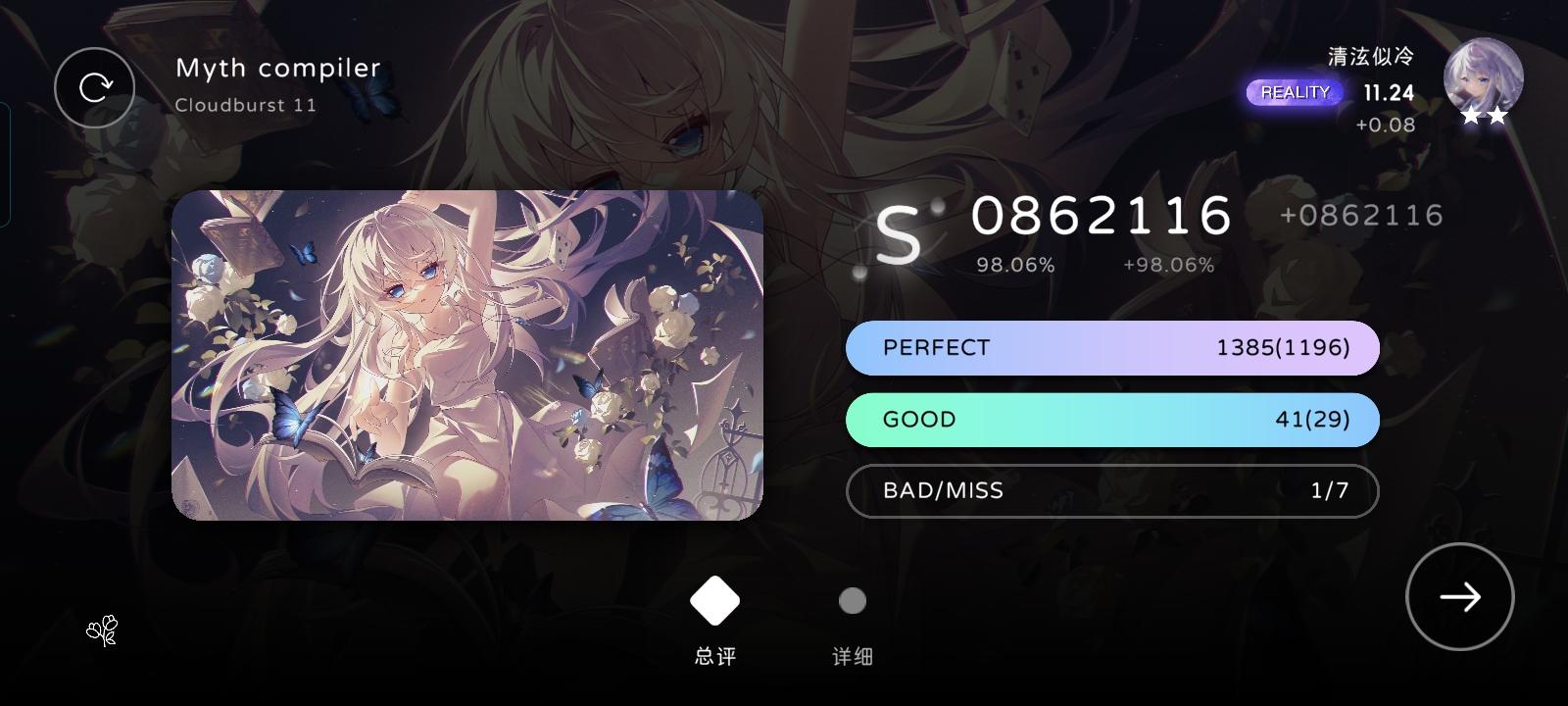 长条看了介绍也不是很懂()打了很久,就p了一首7+,准度也不是很看的懂判定,不知道是延迟没调好还是越级导致的,总之一把下来小p几乎全是late()顺便问问沉浸度是怎么加的,好像加到40%多后打歌不加了?(可能是错觉)还有就是有没有什么歌和谱子推荐()