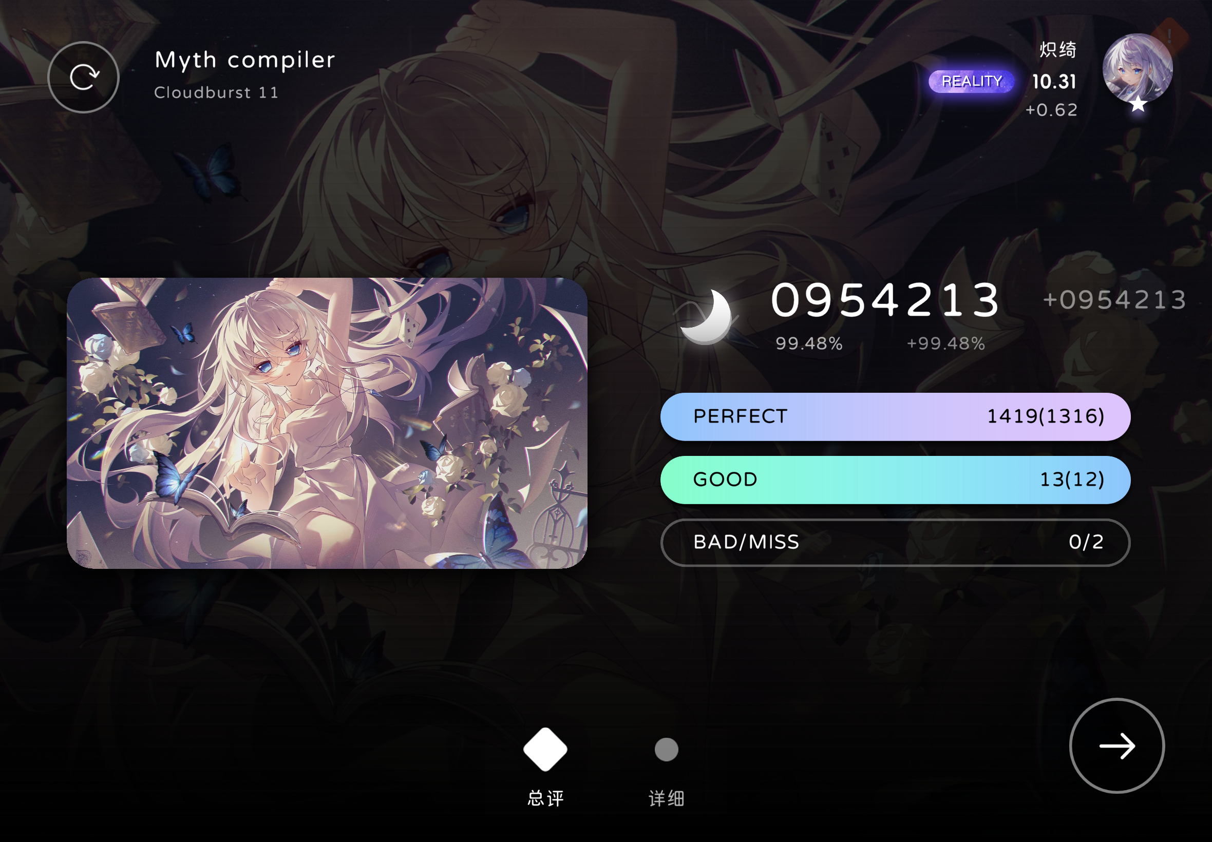 长条看了介绍也不是很懂()打了很久,就p了一首7+,准度也不是很看的懂判定,不知道是延迟没调好还是越级导致的,总之一把下来小p几乎全是late()顺便问问沉浸度是怎么加的,好像加到40%多后打歌不加了?(可能是错觉)还有就是有没有什么歌和谱子推荐()