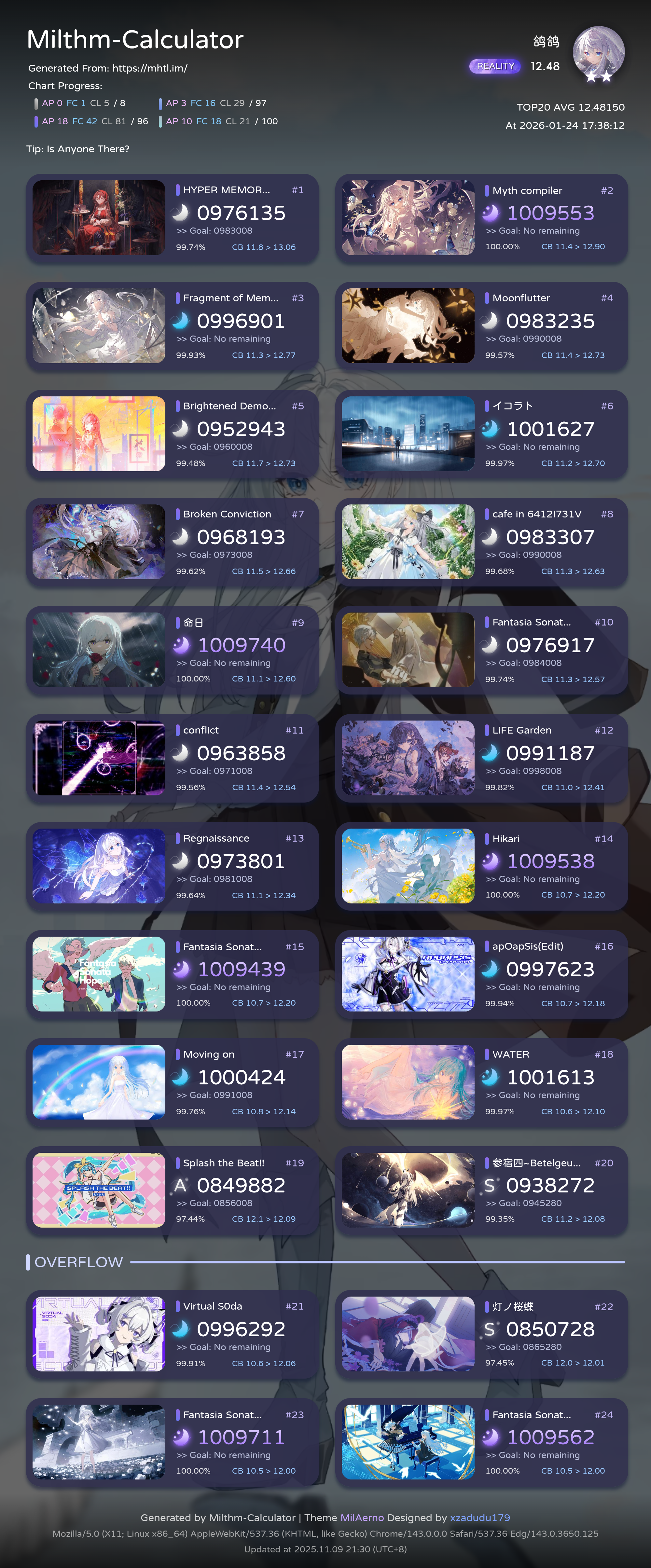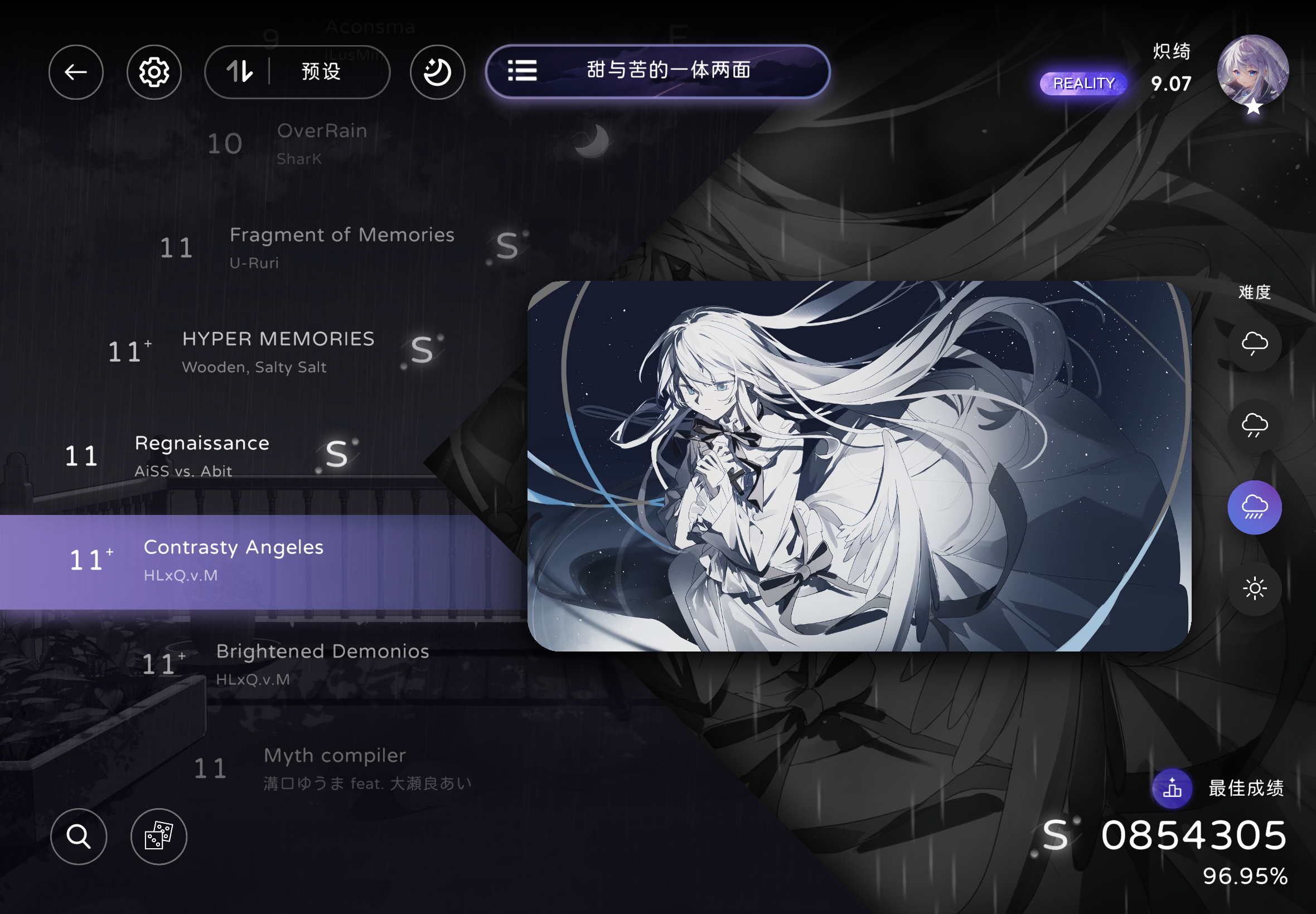终于有驯服延迟的趋势了,主线和支线都只差一首神秘要求的歌没解()入坑来终于p了第二首歌了,说是10+,感觉有点水,准度也比之前好一点了()broken conviction的第四难度纯4k+5k,甚至定轨,可惜4k玩不好,5k不会玩,只玩过键盘,不会敲手机()