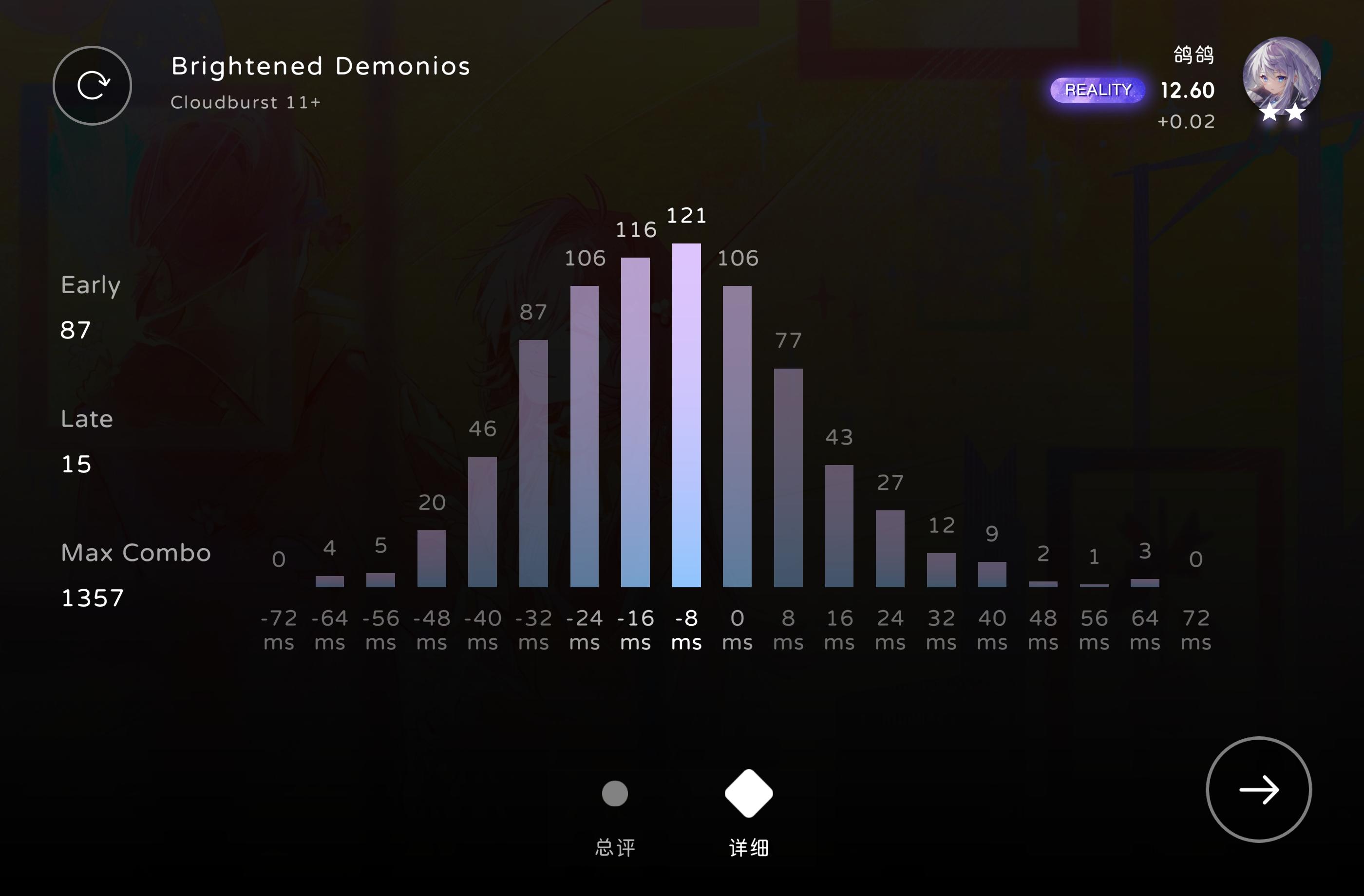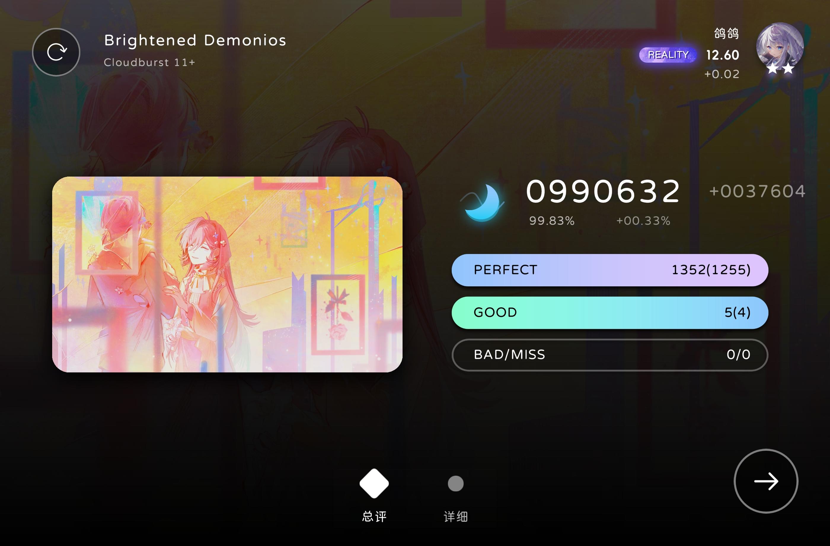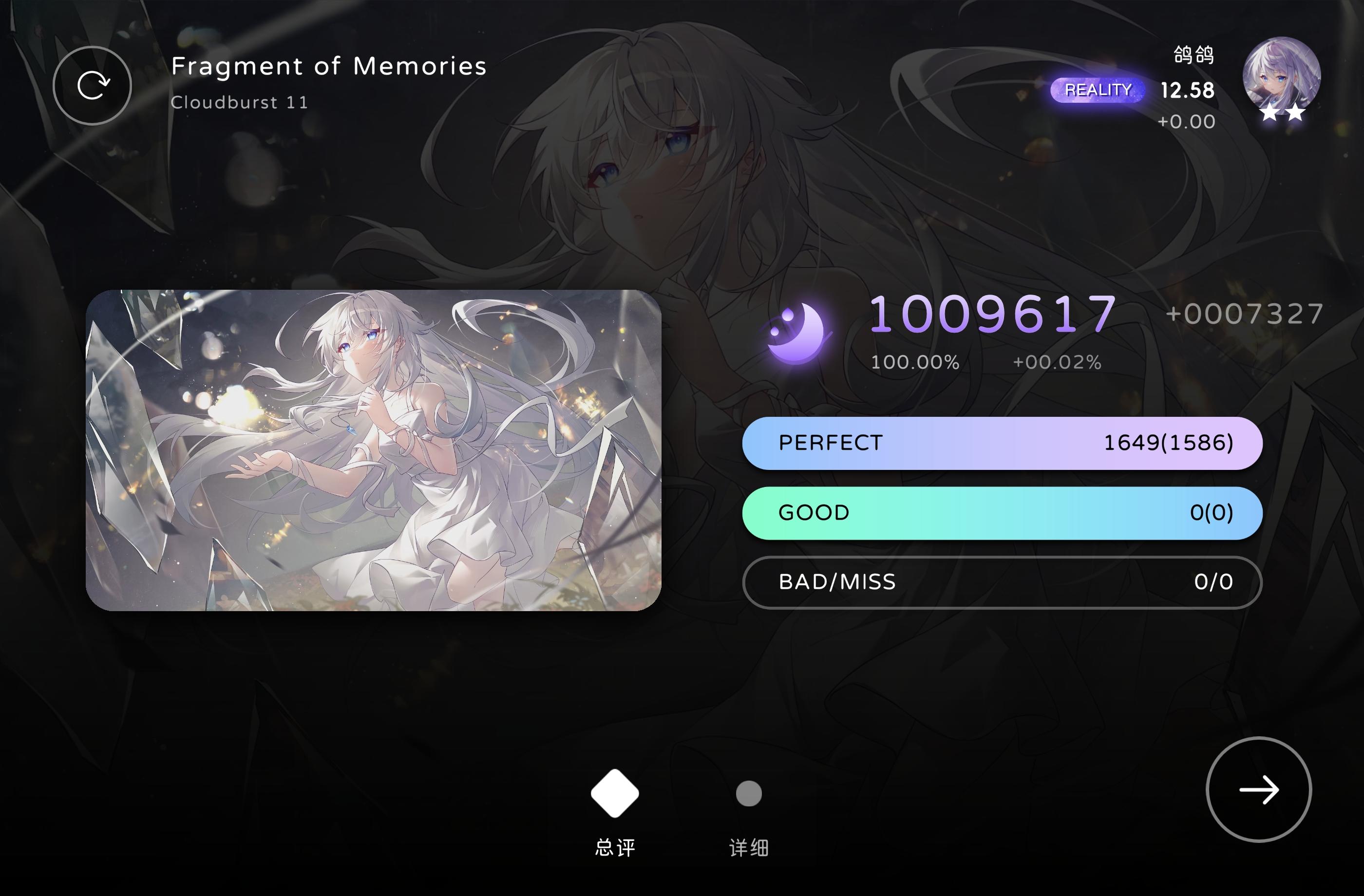 开头走神了,重开一次应该还算是初见吧,我觉得应该是...... 本来录屏是怕错过曲子结束后的异象的,第一章可惜就没记录下这个异象。不过异象没记录下来,倒记录了一个初见AP的屏元,算是意料之外的收获吧[表情_开心](感觉这曲子或许可以作为后日谈用?) 这游戏没用steam的云存档,结果中间重装电脑,忘记手动上传,原来的存档丢了,还好损失不大(本来成绩也不怎么样,听曲看故事去的) 最后,打得真舒服 可