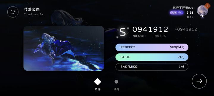 长条看了介绍也不是很懂()打了很久,就p了一首7+,准度也不是很看的懂判定,不知道是延迟没调好还是越级导致的,总之一把下来小p几乎全是late()顺便问问沉浸度是怎么加的,好像加到40%多后打歌不加了?(可能是错觉)还有就是有没有什么歌和谱子推荐()