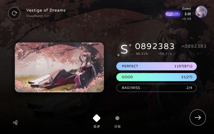 开头走神了,重开一次应该还算是初见吧,我觉得应该是...... 本来录屏是怕错过曲子结束后的异象的,第一章可惜就没记录下这个异象。不过异象没记录下来,倒记录了一个初见AP的屏元,算是意料之外的收获吧[表情_开心](感觉这曲子或许可以作为后日谈用?) 这游戏没用steam的云存档,结果中间重装电脑,忘记手动上传,原来的存档丢了,还好损失不大(本来成绩也不怎么样,听曲看故事去的) 最后,打得真舒服 可