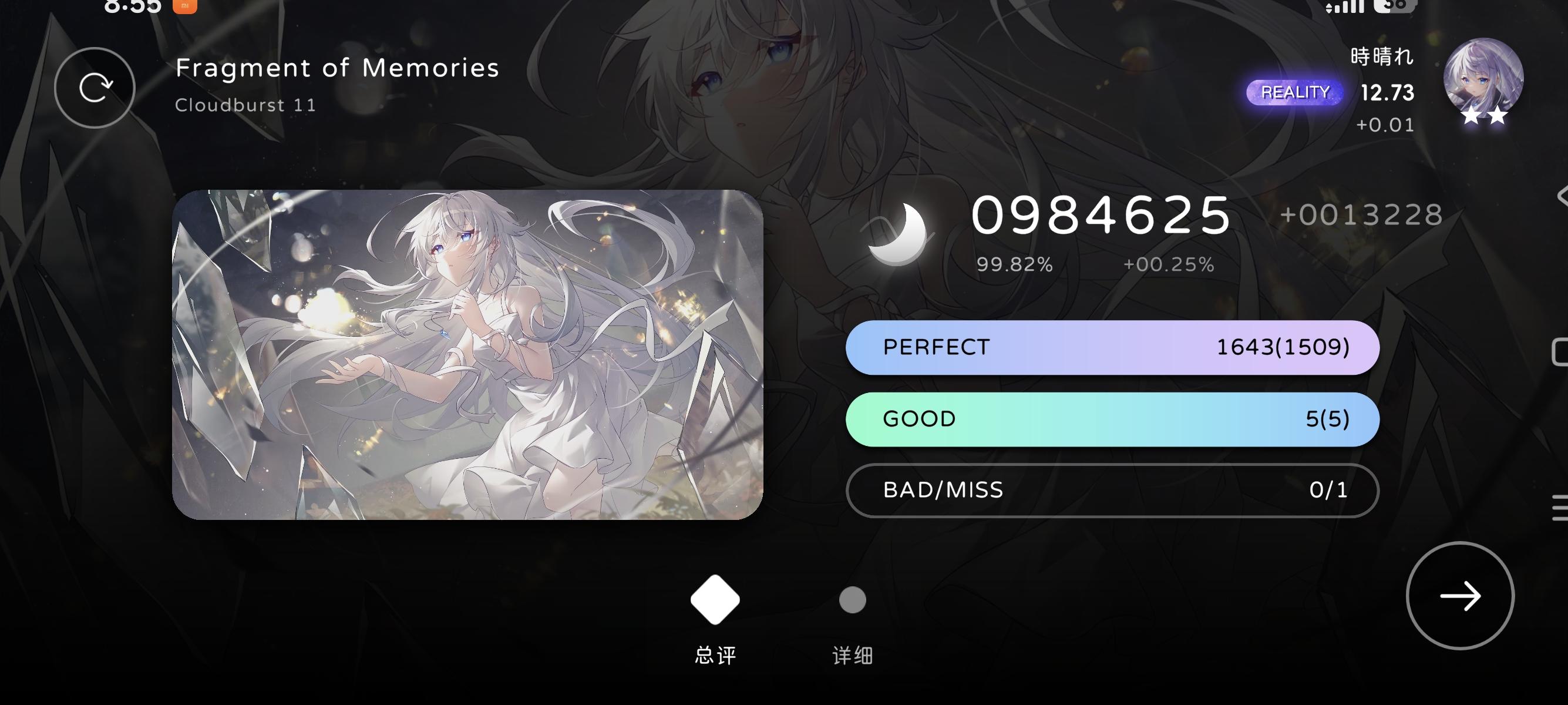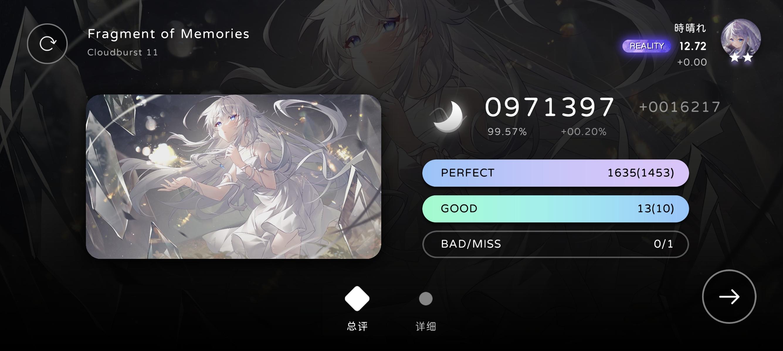 因为一直打不到紫reality,明明查分器上显示已经紫了,前20首也是新成绩,但还是白的,然后之前剩下的旧谱面也打不上去,所以决定从零开始,但还是留了个存档保底的,什么时候不想打了再下载存档回来,反正现在也到了瓶颈期。唯一恼火的是星要重打了,还要种不知道多久的地……唉,也许,只有当自己亲手毁灭自己所拥有的一切后,才能更放下自己骄傲的资本吧。希望早日重回11+