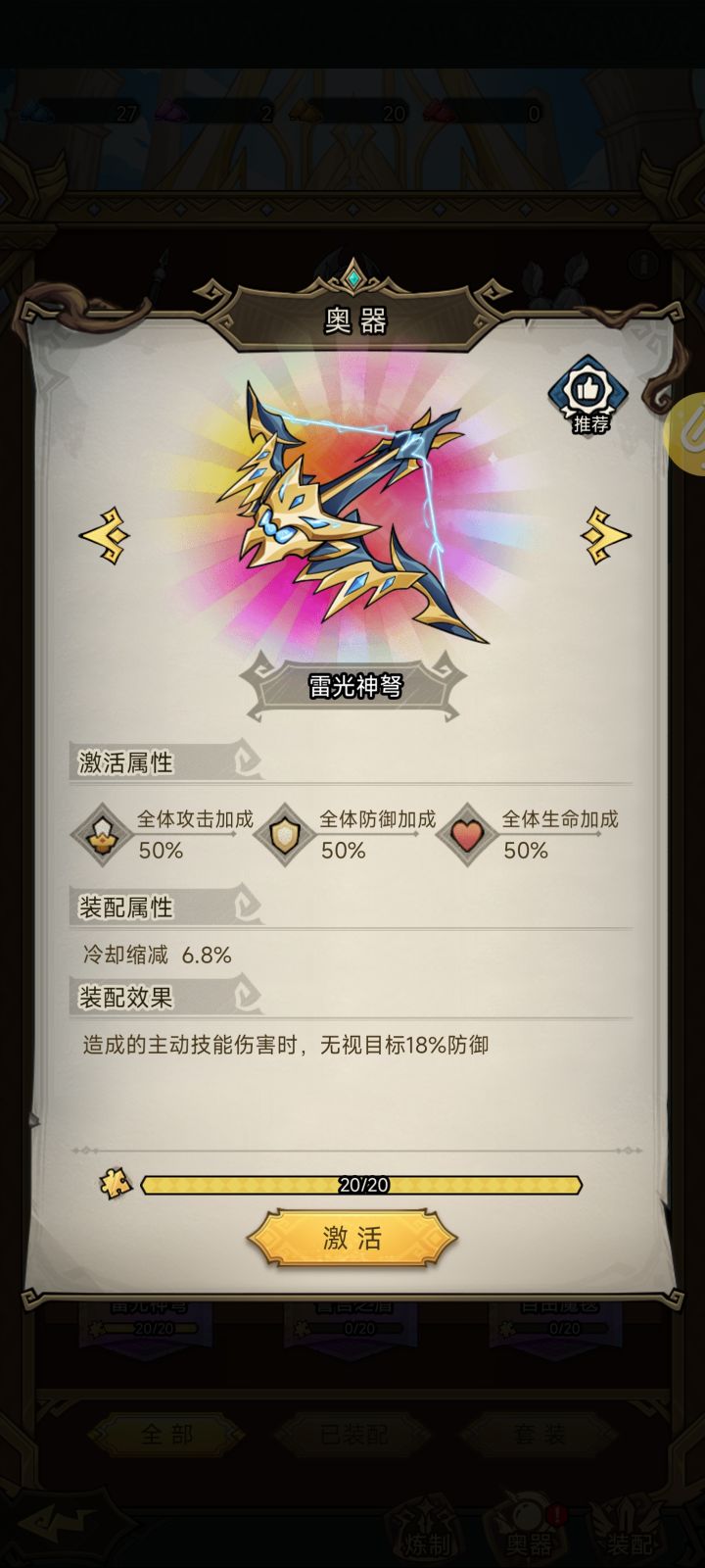 奥器佩戴推荐,都是自己脑测的,有异议根据自己的想法带就好了。推荐顺序从左到右,只做了比较热门的森灵,粉色奥器只要玩下去都会有的,所以史诗、典藏品质的奥器就不做推荐了。主角:誓言之盾、逐光金苹果、逐日盏、善恶雕像、阿萨奇之冠机甲(女王):雷光神弩、点金之手、巫术之帽(冷却不满60%的情况佩戴)、水晶棋子、悠悠铃花妖(小鹿、赋予之手):自由魔毯、巫术之帽、丛林之证、魔女大锅、冒险者旗帜魔灵娃娃