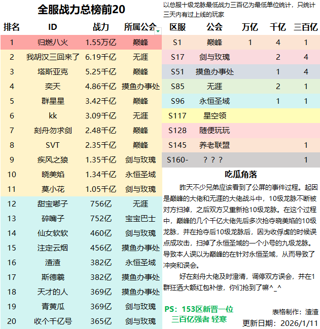 覆盖总服务器战力前20位,并且三天内有上线的玩家,退坑玩家数据不保留。同时统计各区主要公会及战力分布。新增吃瓜角落,实时更新一些趣闻和动态。本表格每周更新最新数据,如有纰漏和延迟,欢迎指出!#奥丘攻略