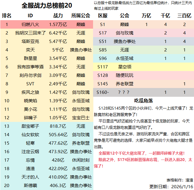 覆盖总服务器战力前20位,并且三天内有上线的玩家,退坑玩家数据不保留。同时统计各区主要公会及战力分布。新增吃瓜角落,实时更新一些趣闻和动态。本表格每周更新最新数据,如有纰漏和延迟,欢迎指出!#奥丘攻略