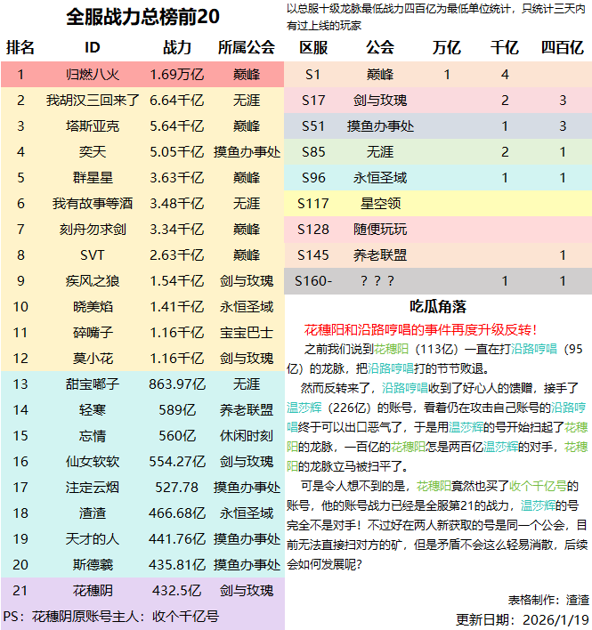 覆盖总服务器战力前20位,并且三天内有上线的玩家,退坑玩家数据不保留。同时统计各区主要公会及战力分布。新增吃瓜角落,实时更新一些趣闻和动态。本表格每周更新最新数据,如有纰漏和延迟,欢迎指出!#奥丘攻略