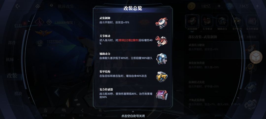 游戏中有六种类型和五种特性的机体,机动克制可变、可变克制通用、通用克制重型、重型克制机动,特殊形态和改造追加互相克制。攻击克制类型的机体可额外获得30%的伤害加成 上阵相同或不同类型的机体可获得对应的属性加成效果,前期可根据敌人阵型尝试上阵5台相同类型的机体。 优先核心机体:优先提升核心机体的等级和性能,如自由高达、天帝高达等。自由高达是全能输出,必杀技按目标耐久百分比造成伤害,综合泛用性高;