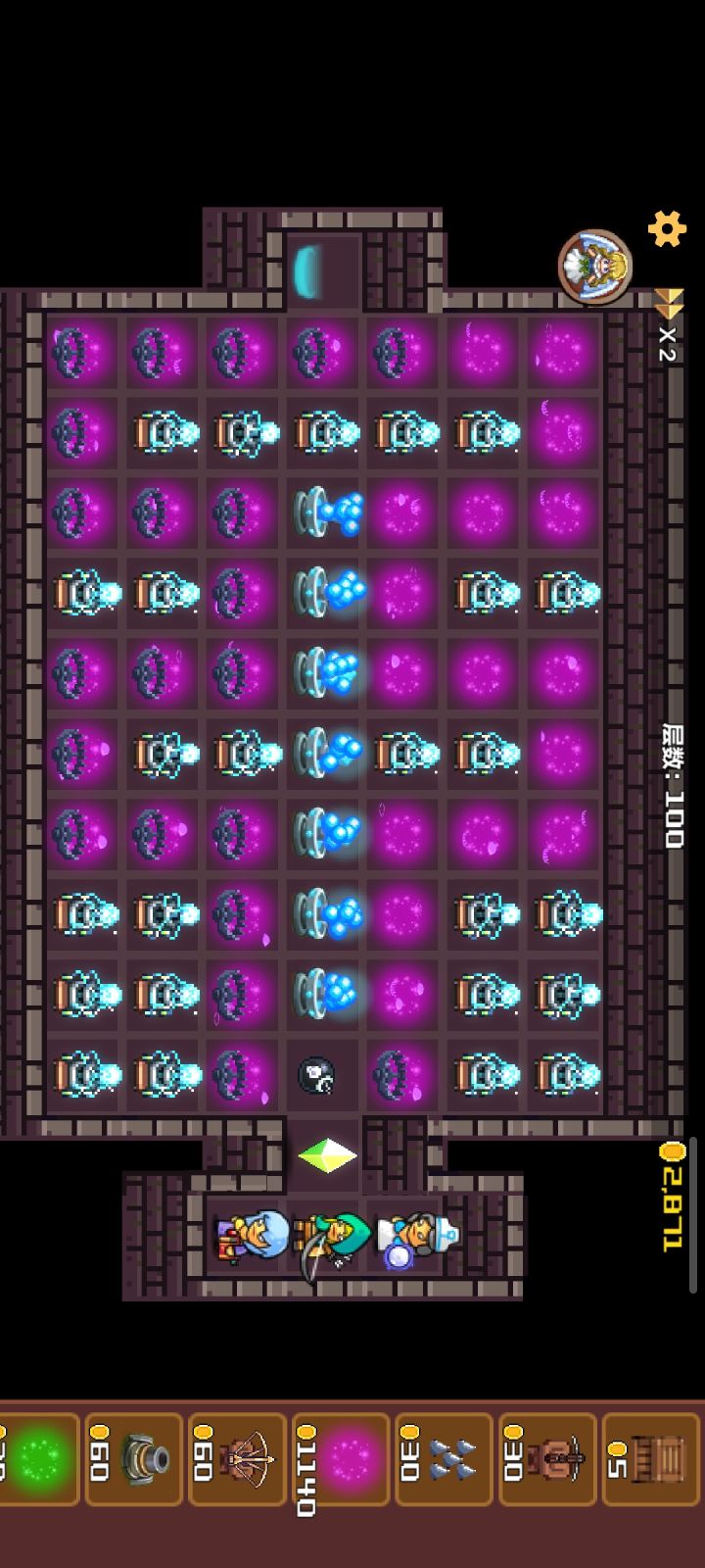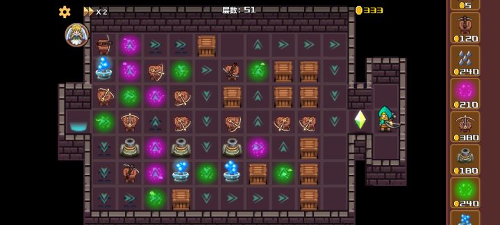玩法有些一般,初看之下会感觉比较有意思,可随意摆放炮塔位置,形成最优曲线,主角也可以参与战斗手动控制输出方向。然而地图就一张,可能一百层之后会有新的,但是个漫长的过程。所有位置都安排满炮塔之后,就变成了纯数据流,只剩下升级和重置了,游戏乐趣相对减少很多。没有设计外围养成内容,全部升级都在炮塔和地面陷阱上。