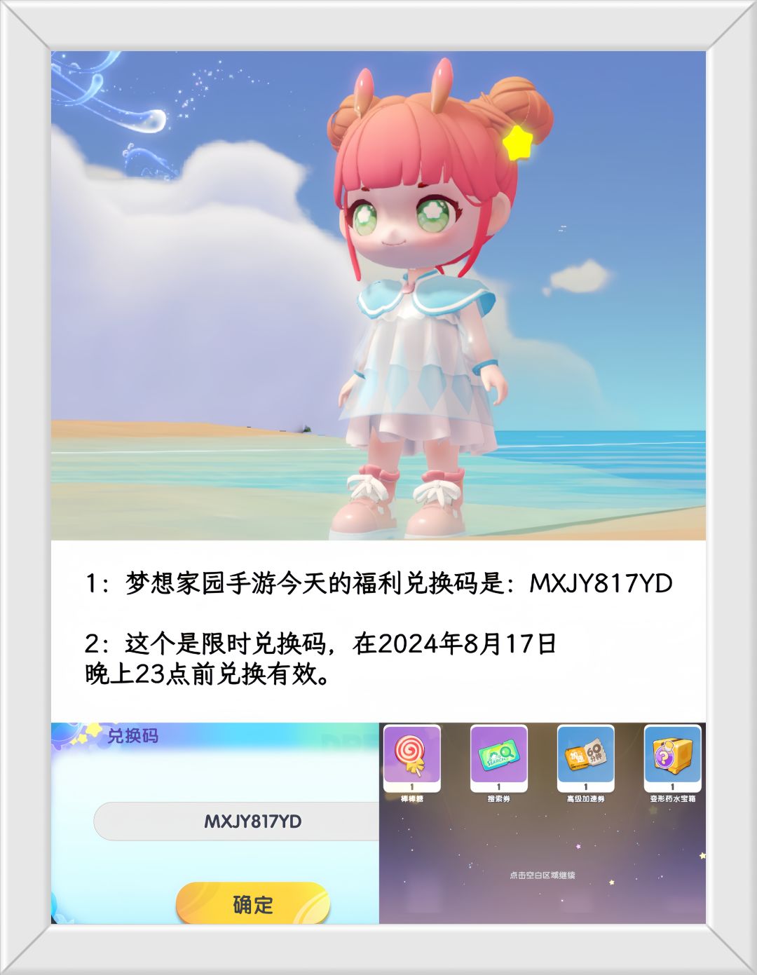 温馨提醒:梦想家园8.17日限时福利兑换码。