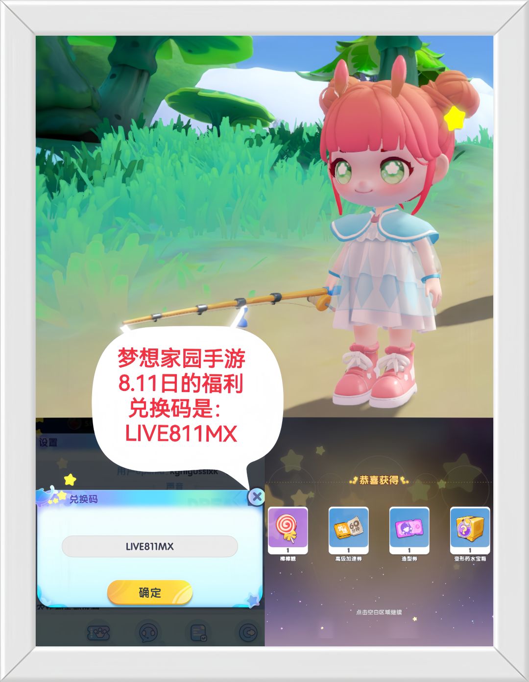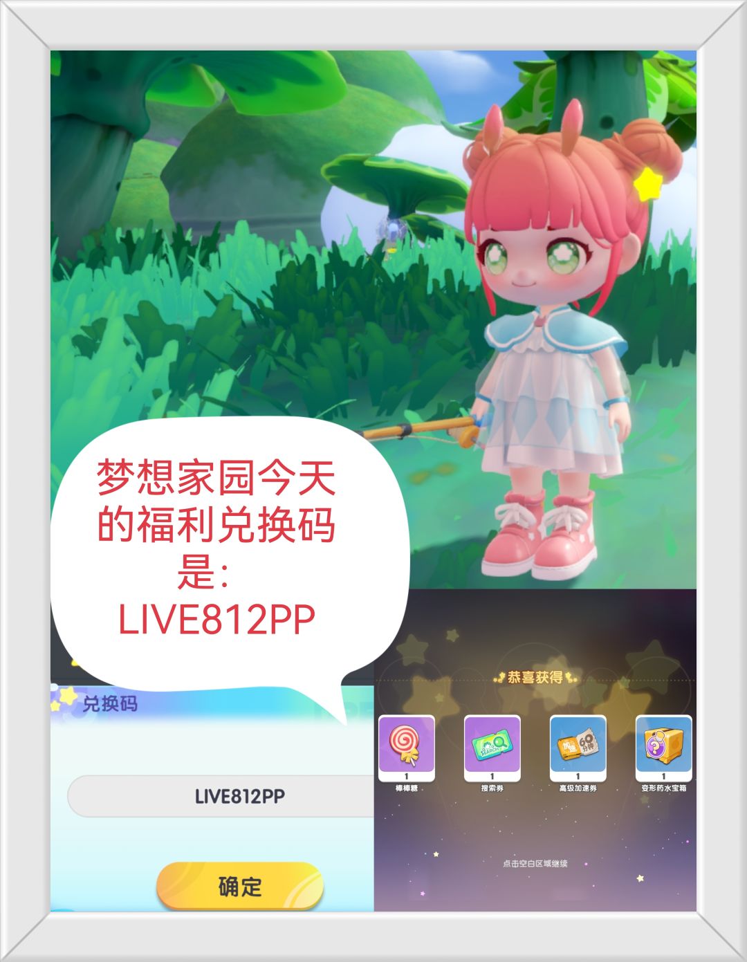 梦想家园今天的福利兑换码是:LIVE812PP