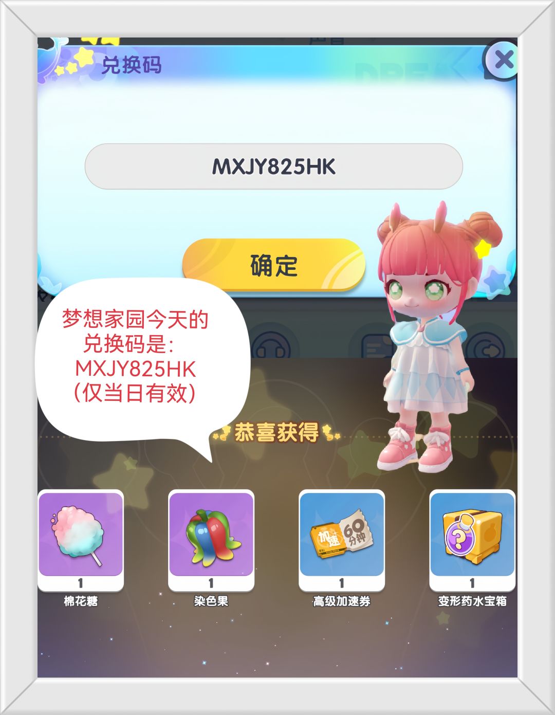 梦想家园今天的福利兑换码是:MXJY825HK