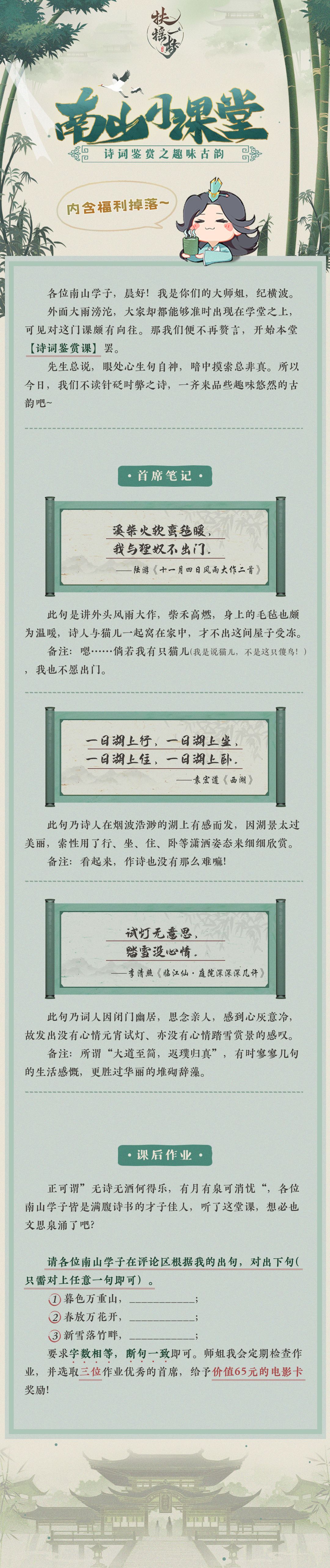 啾啾啾~ 各位首席们好呀,今天又是大师姐来给大家上课咯~ 这节南山课堂的主题是——鉴风雅诗词,品趣味古韵 师姐还给大家布置了课后作业哦, 完成就有机会获得策划大大友情赞助的电影卡! (听说最近《长安三万里》在热播,本鸟也好想去看呀!) 以下是本次活动中奖名单,请中奖的首席大大尽快添加发奖小助手(QQ:1023868788)进行领奖,超过7天视为放弃领奖资格~